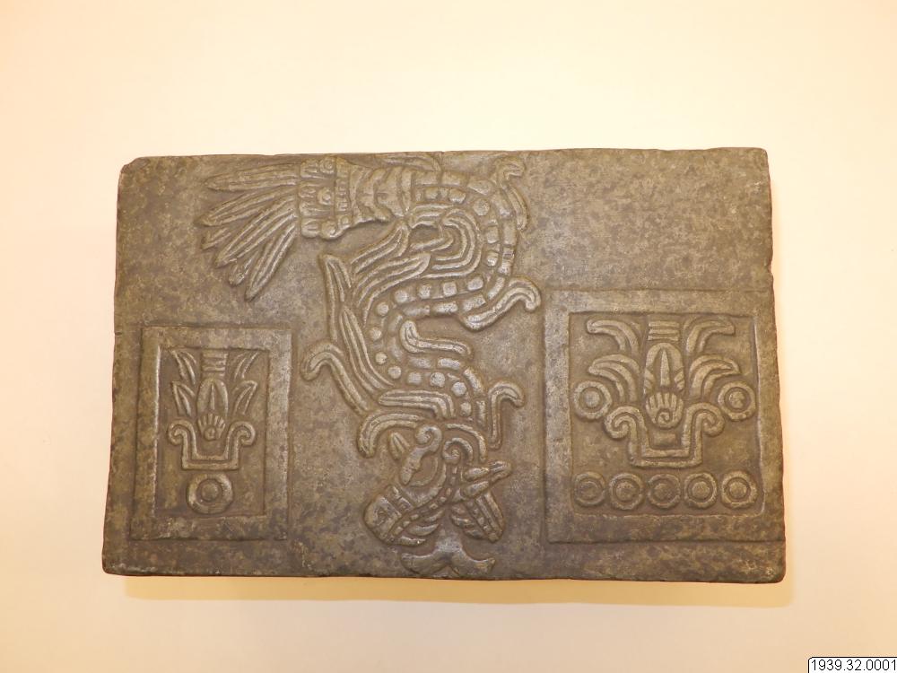 Inventar: "Askkista. Gipsavgjutning från original i Museum fuer Völkerkunde, Hamburg (Hackmacks samling). Ursprung okänt, troligen Mexicodalen. Originalet är hugget ur grågrön sten och lock, som sluter till omkring lådans upphöjda inre kant. Formen är rektangulär med platt lock och botten. Alla större ytor äro försedda med reliefer. På lådans framsida bilden av en sittande figur med en hieroglyf som Seler tyder såsom tecken för 'den döde krigarens själ' (Seler Abb. 18). Motstående långsidas figur tyder Seler såsom Tepeyollotli, hålernas eller grottornas gud. Kortsidorna och bottens inre uppta datumtecken, som torde symbolisera nordens och sydens regioner. Bottens undersida upptas av det grodliknande vidunder, som aztekerna tänkte sig i jordens inre och som här symboliserar des undre, jorden. Lockets reliefer beteckna det övre, den himmelska regionen. På översidan i mitten Quetzalcoatl och de två datumtecken som skola symbolisera gudens förvandling i morgon- och aftonstjärna. Lockets undersida upptar en av ögon omgiven cirkel i vars mitt befinner sig en dödskalle, som enl. Seler kan beteckna Ilamatecutli, den gamla jordgudinnan, som samtidigt är den gamla himmelsgudinnan, natten och stjärnhimmeln."