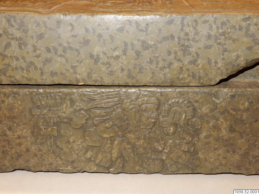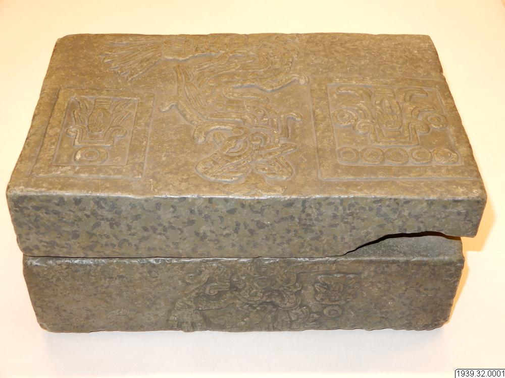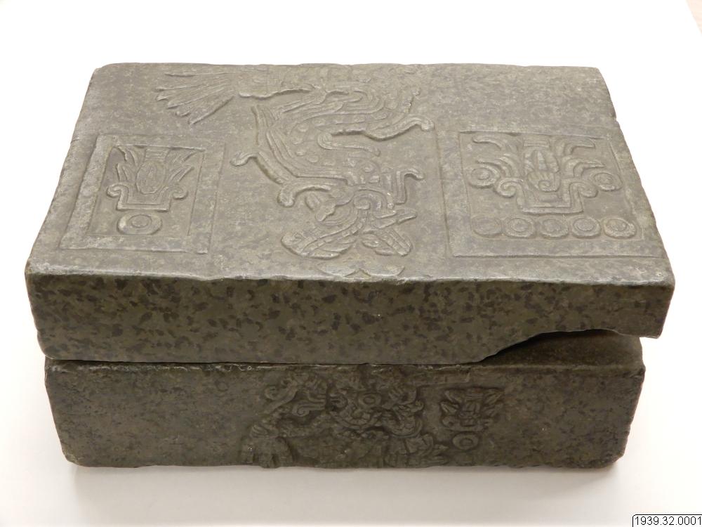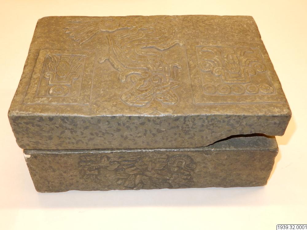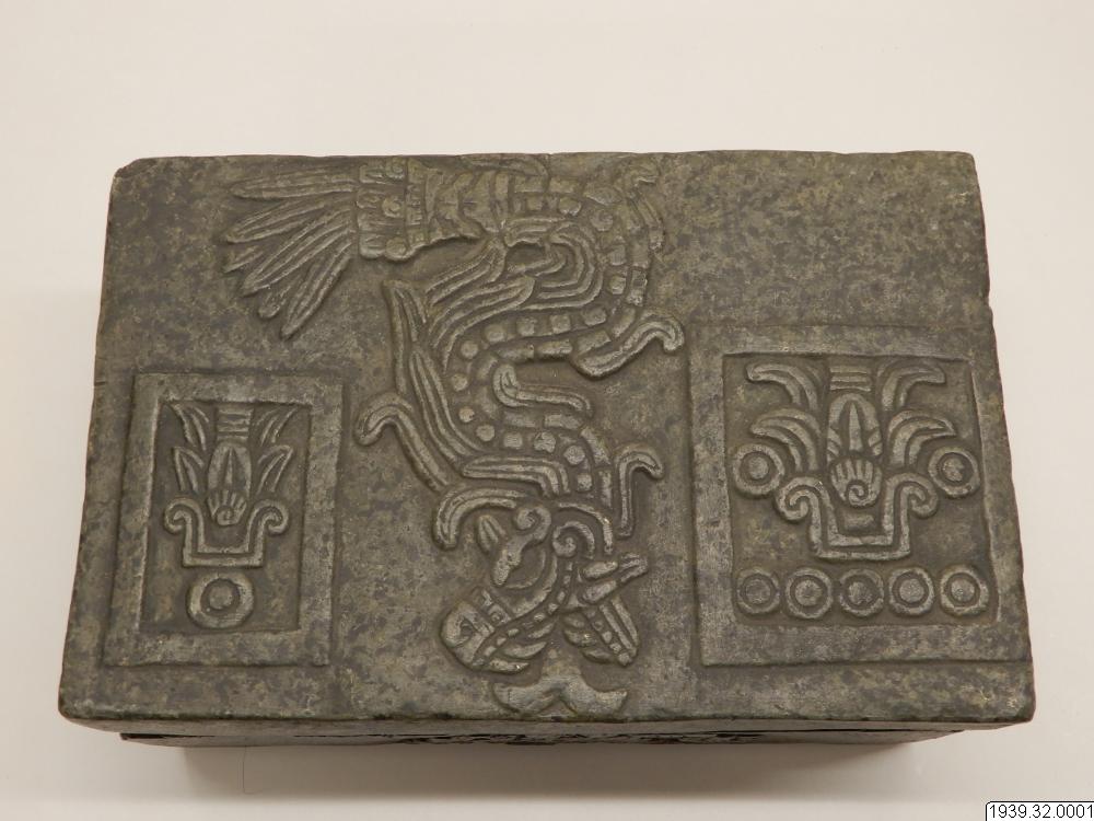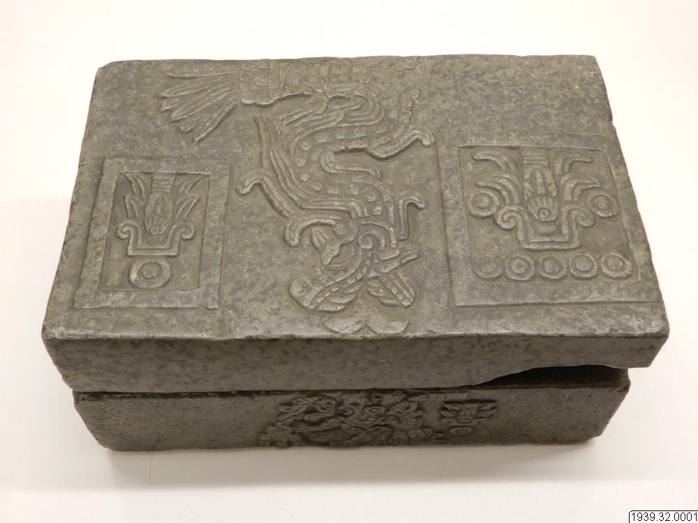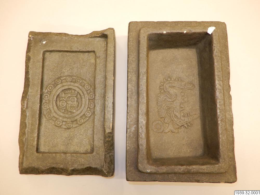 Inventar: "Askkista. Gipsavgjutning från original i Museum fuer Völkerkunde, Hamburg (Hackmacks samling). Ursprung okänt, troligen Mexicodalen. Originalet är hugget ur grågrön sten och lock, som sluter till omkring lådans upphöjda inre kant. Formen är rektangulär med platt lock och botten. Alla större ytor äro försedda med reliefer. På lådans framsida bilden av en sittande figur med en hieroglyf s...