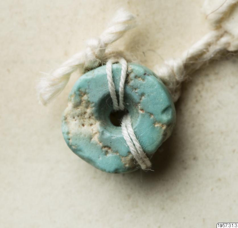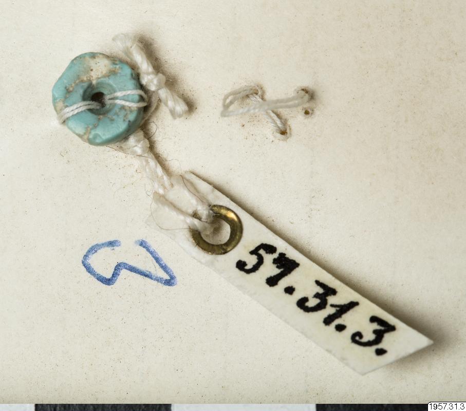 • Liten platt rund pärla av turkos med ett borrat hål i mitten. Fastsydd med vit tråd på ett tunt pappark.