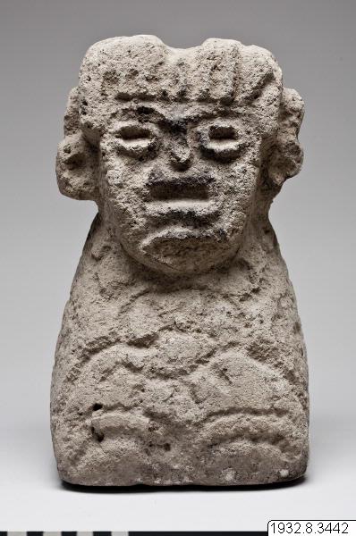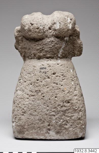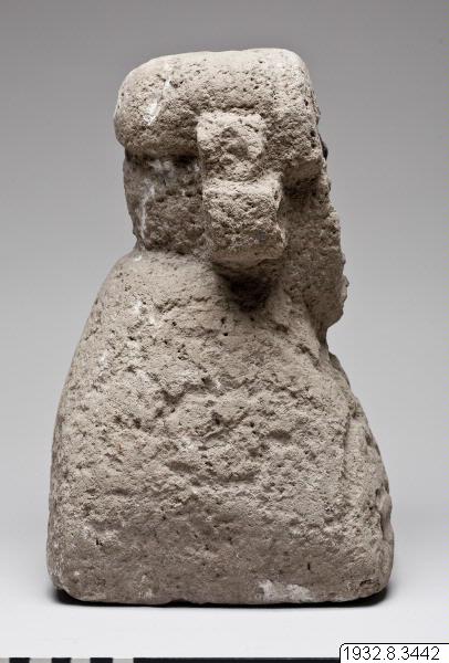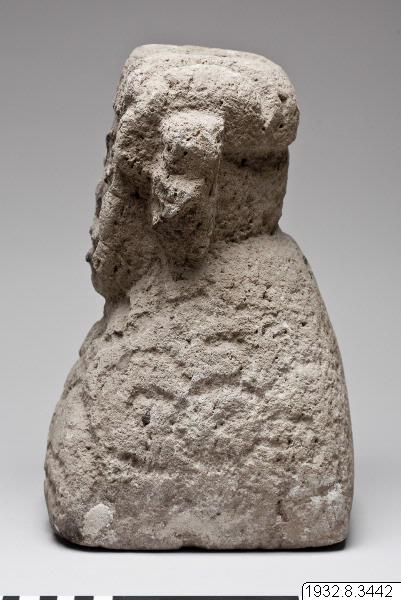 Skulptur/stenfigur. Huvudet och axelpartiet endast utformat. Ansiktet är format på ett egendomligt sätt. Det är i det närmaste plant och inte bara ögon och mun, utan även näsa har huggits ut ur denna plana yta. Figuren påträffades omedelbart intill nedgången till grottan under denna skärning. (generalkatalogen)