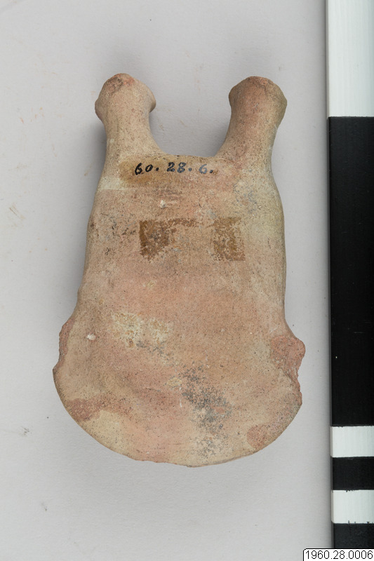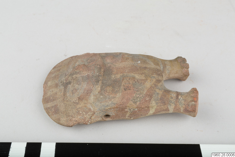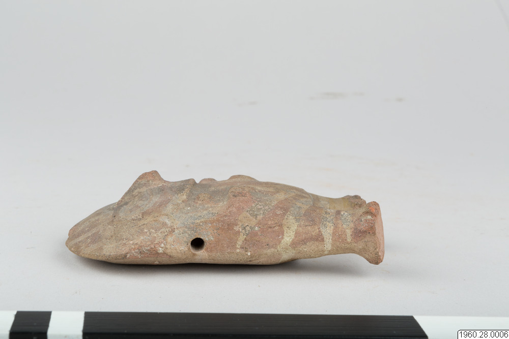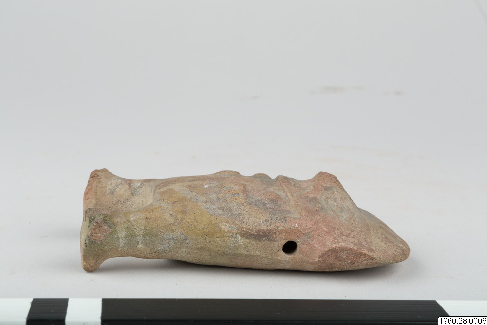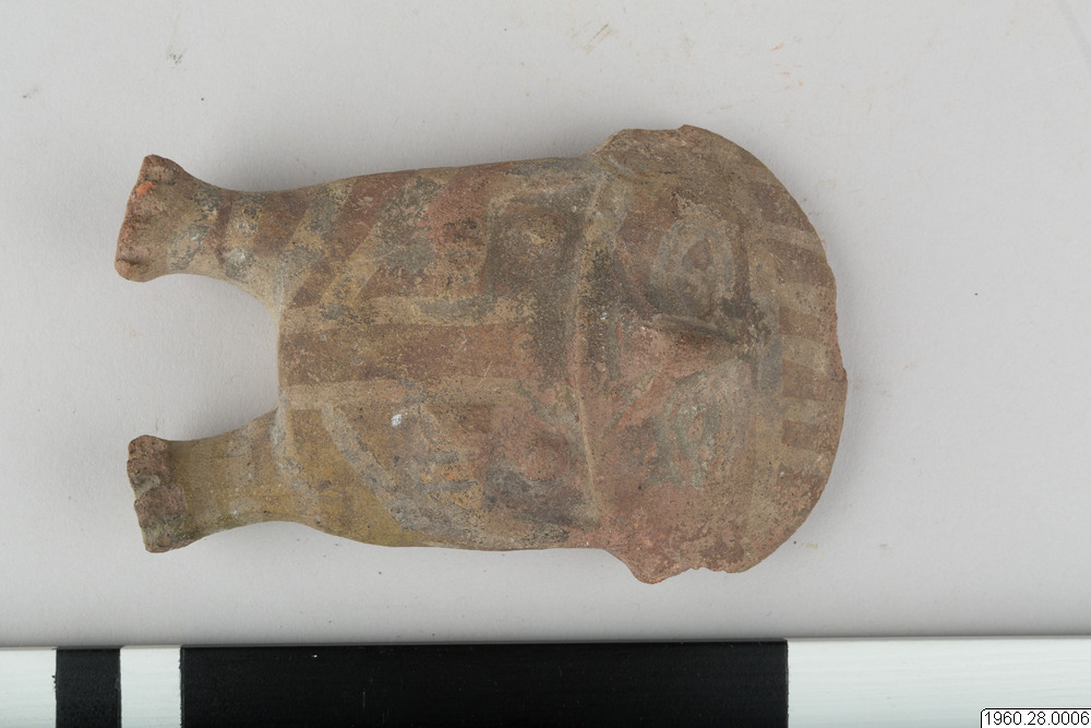Lerfigur. Föreställer en människa. Brunt gods. Korta raka ben med tårna markerade genom intryckta linjer. Bröstvårtor, de över bröstet böjda armarna och ansiktets detaljer utförda i relief. På framsidan också målad dekor i vitt. Ett hål i båda axelpartierna leder in till håligheten i figurens inre. Öronen något skadade.