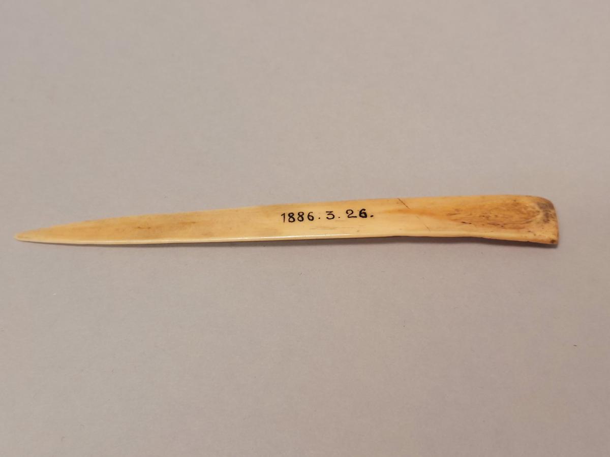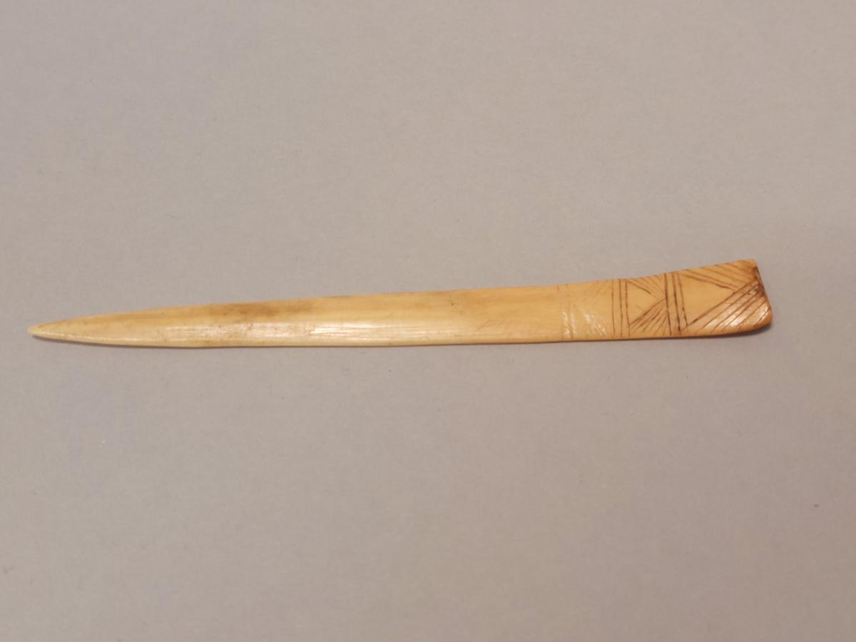• Hårpil av ben, dolkformig. Prydd med inristningar.