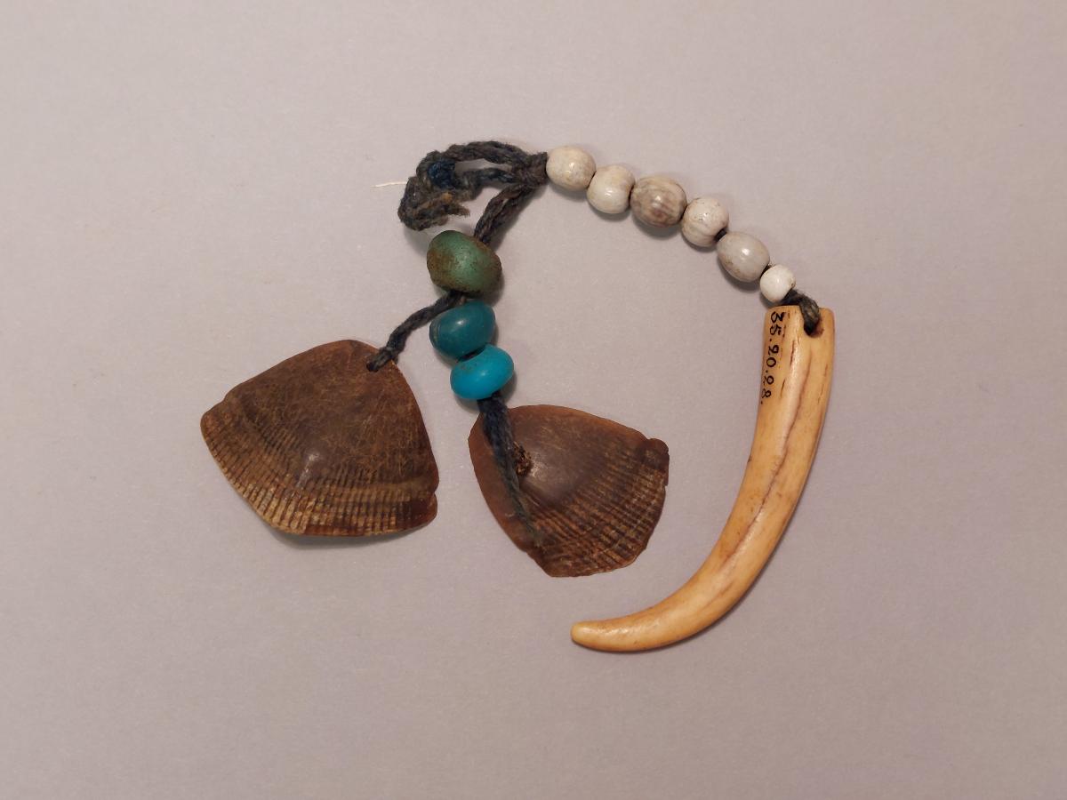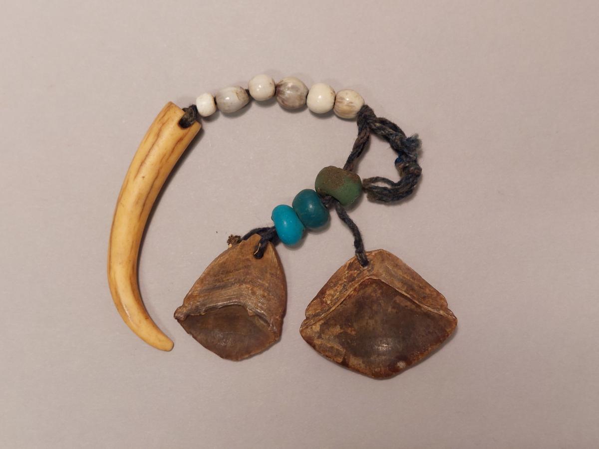 • Hängprydnad med en tand och snodd av coixfrön, glaspärlor samt bitar av musselskal. (generalkatalogen)