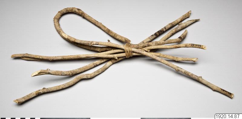 Trädgrenar, 6 stycken smala trädgrenar, icke avbarkade. En av dem kraftigt böjd. Användning? Råmaterial? Längd 40-45 cm Queensland, Australien. (generalkatalogen)
