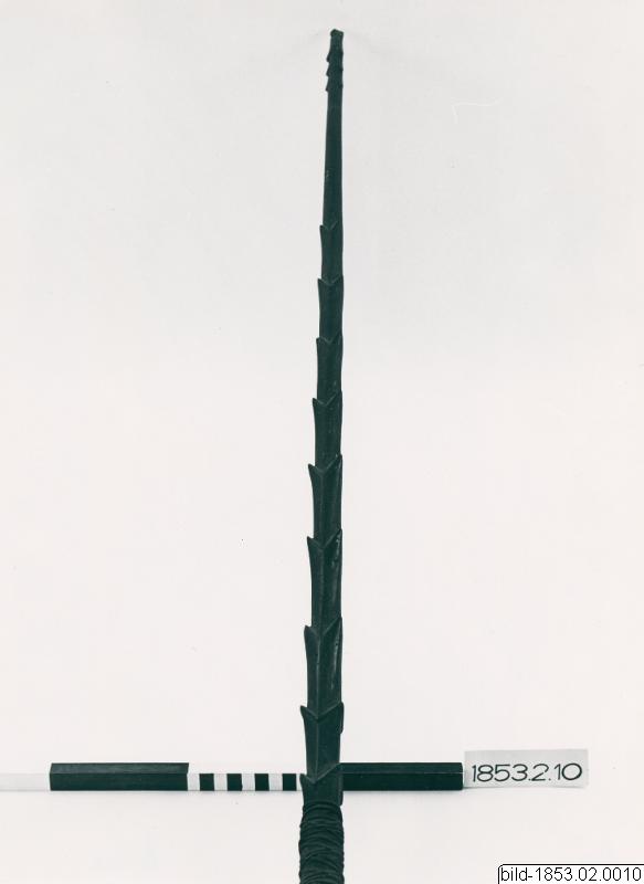 • Kastspjut av trä med snidad, i eld härdad träspets. Nedanför spetsen lindningar av bast- eller hårflätor.