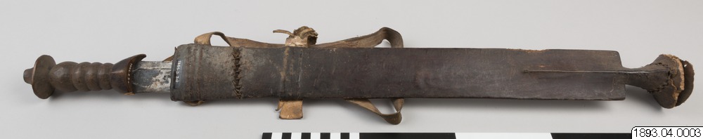 • Svärd med läderbeklädd skida av trä och gehäng av vitt skinn. Klingan rak, tveeggad, skarpt spetsig, fästet av trä (generalkatalog).