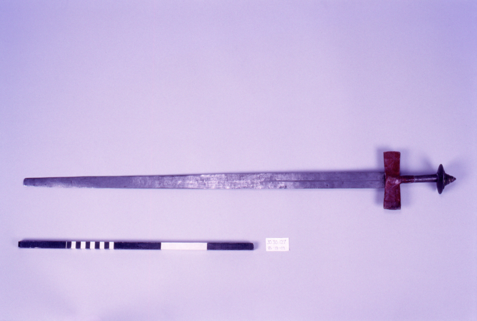 • Svärd. Rak, tveeggad, ej spetsad klinga. Korsformigt, läderklätt fäste med konisk ändknapp av metall (järn, mässing). (generalkatalog)