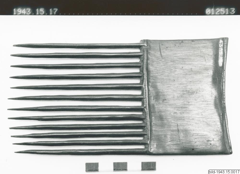 • Kam. Vackert glansig av brunt trä. Rektangulär platta med svagt övre sida och med 12 tänder. Längd: 15,8 cm. Bredd: 8,5 cm. Afrika.