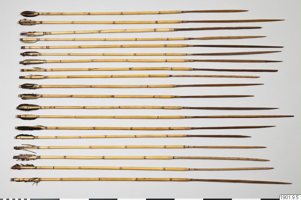 • Pil av (vass?-)rör med spets av trä, 19 stycken. De flesta spetsarna tresidiga. Korta styrfjädrar, en del i klara färger.