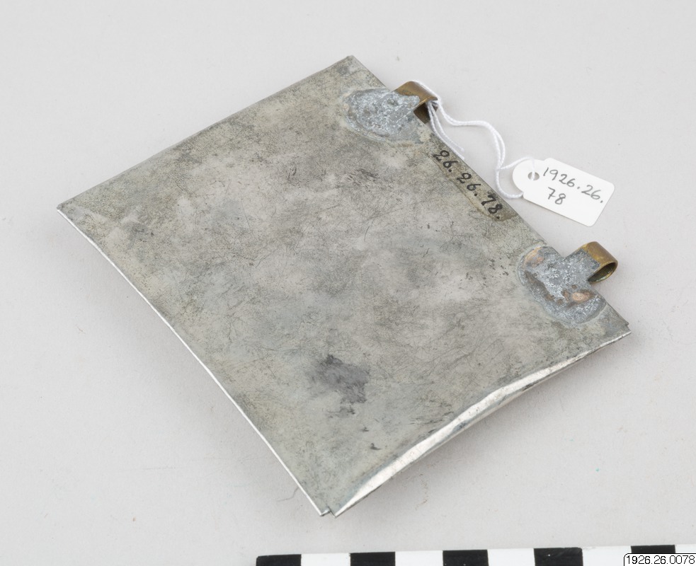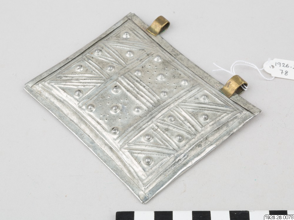 • Marabout av silver. Ett slutet rektangulärt etui med pressade ornament på framsidan. Upptill två mässingsmärlor fastlödda.