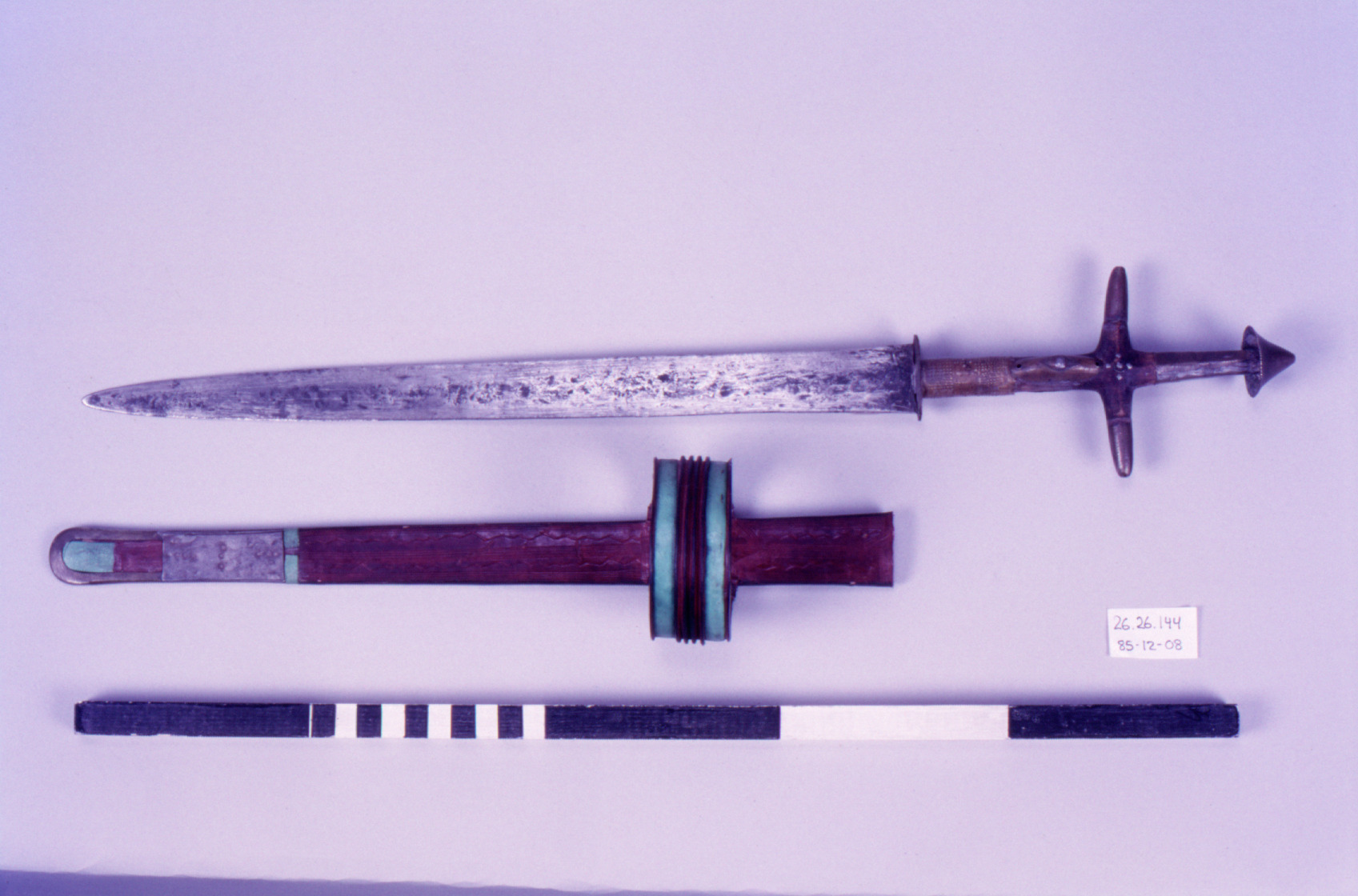 • Armdolk. Klingan tveeggad, utan blodränder eller gravyrer. Fästet korsformigt, beslaget med mässing, koppar och järn. Skidan av läder med pressade ornament, delvis plåtbeslagen, upptill förenad med en fastnitad bred läderring för armen. Dolken bäres med fästet nedåt på vänster arm. (generalkatalog)