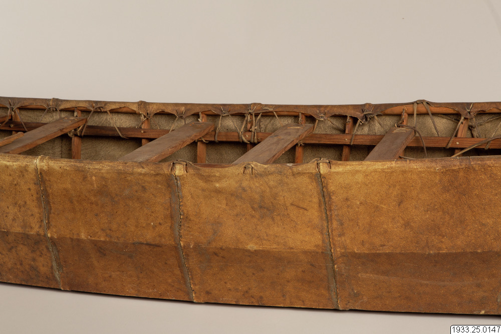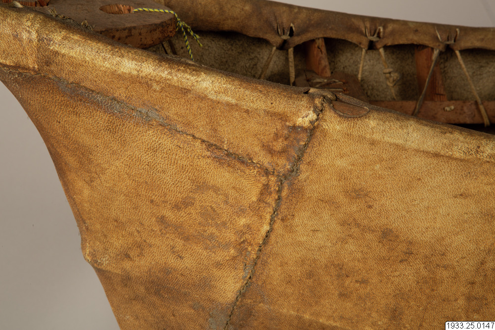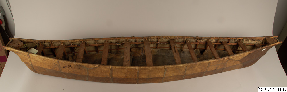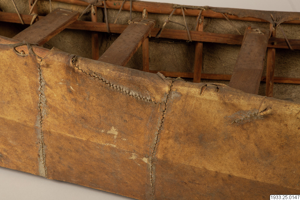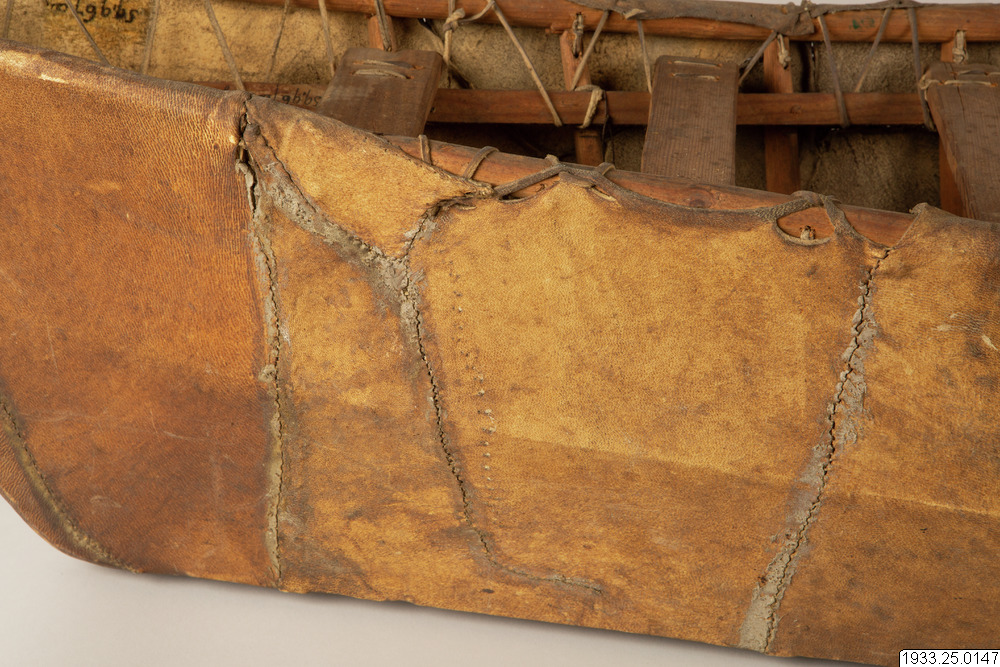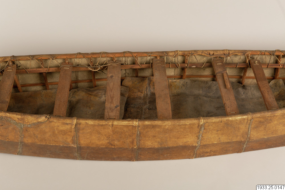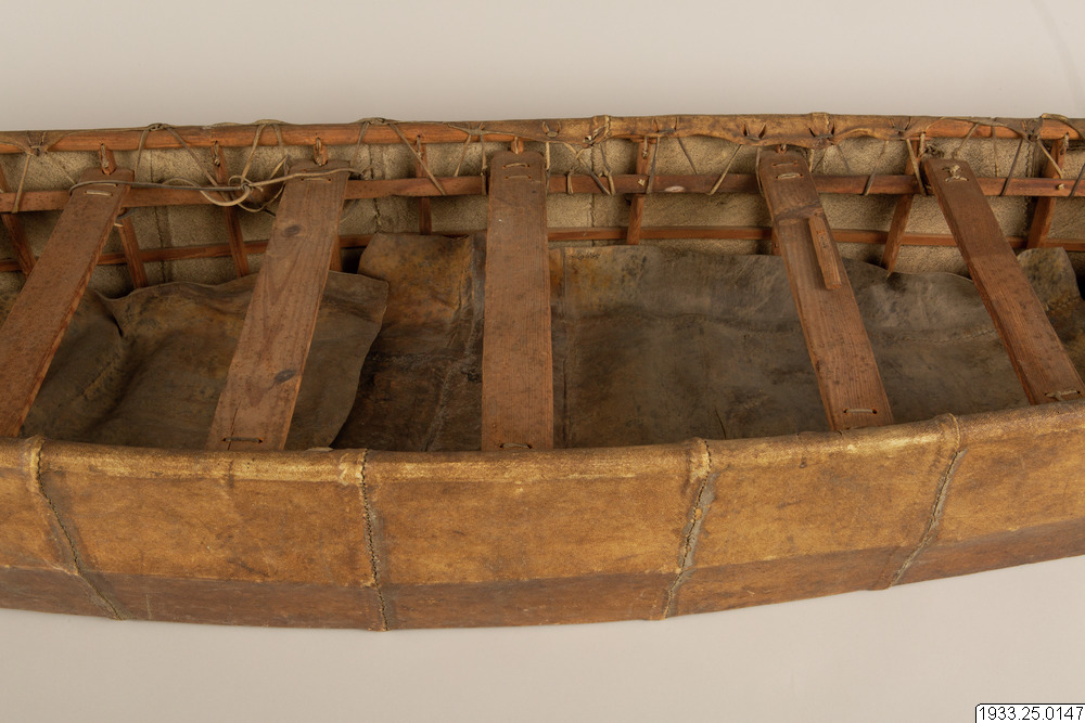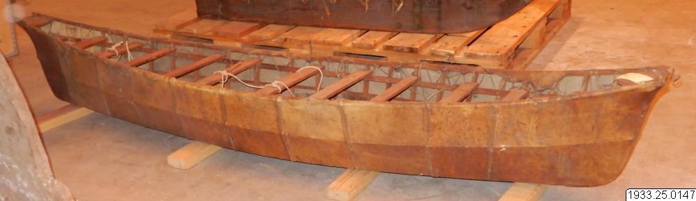 Kvinnobåt, "Umiak", modell. Båten består av sälhud spänd över ett träskelett. 11 bänkar, 4 rodderskor (nr 150), en styrare (nr 151), 6 åror (nr 148), 3 skinn och 1 segel (nr 149). Holstensborg, Västgrönland