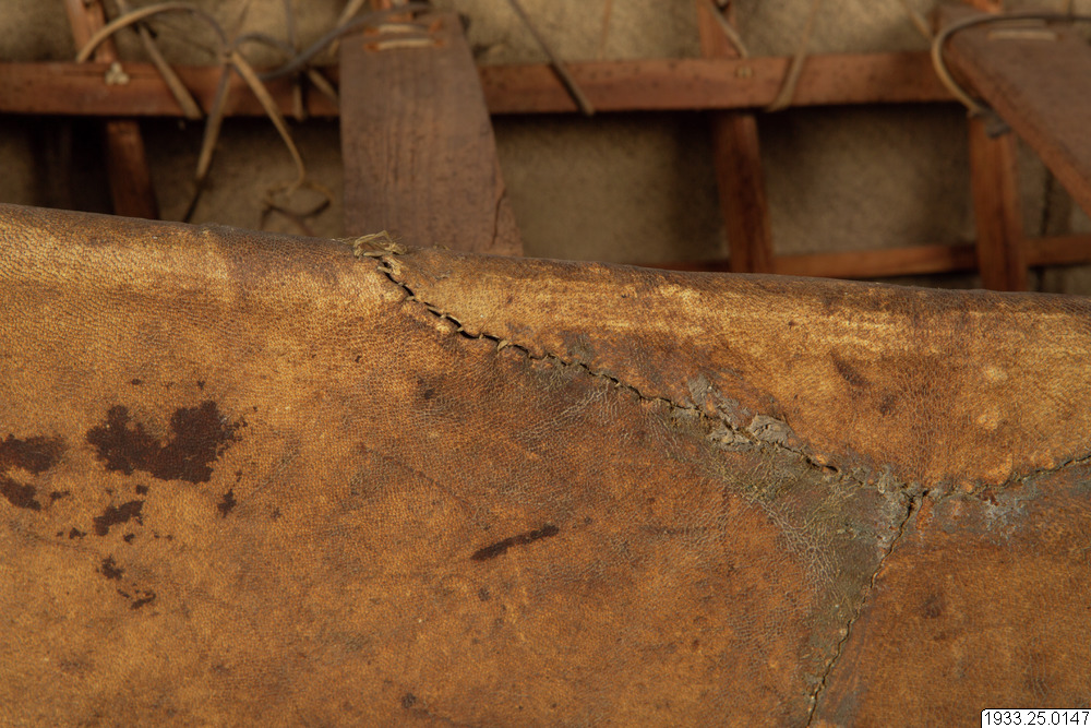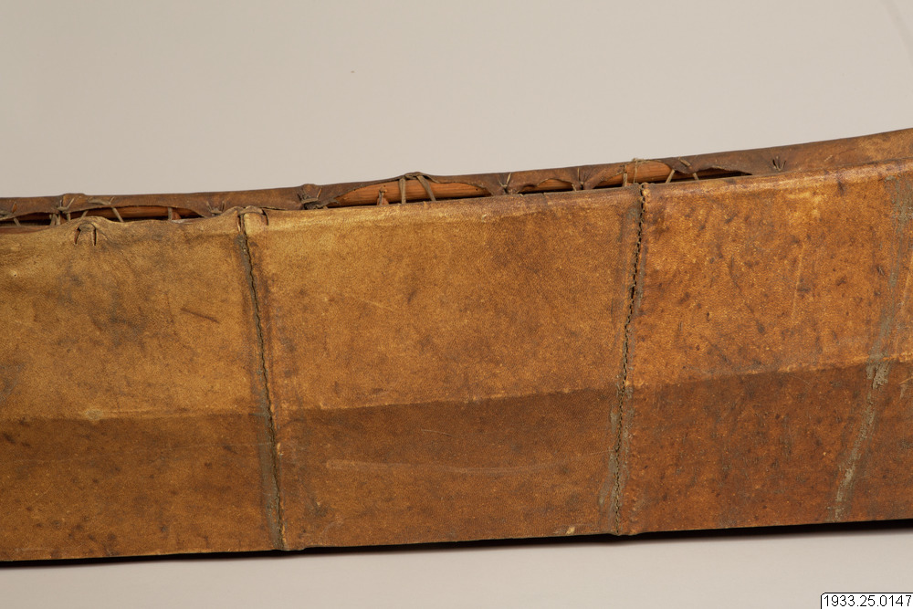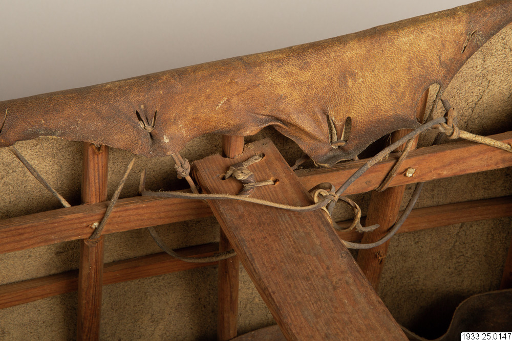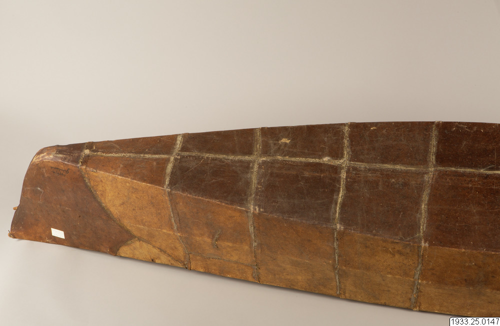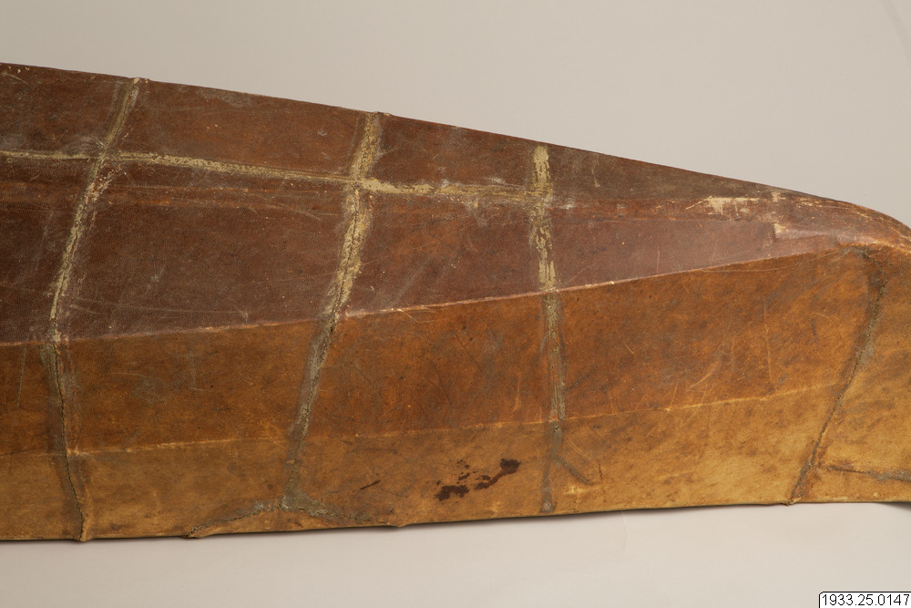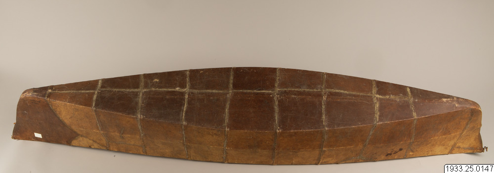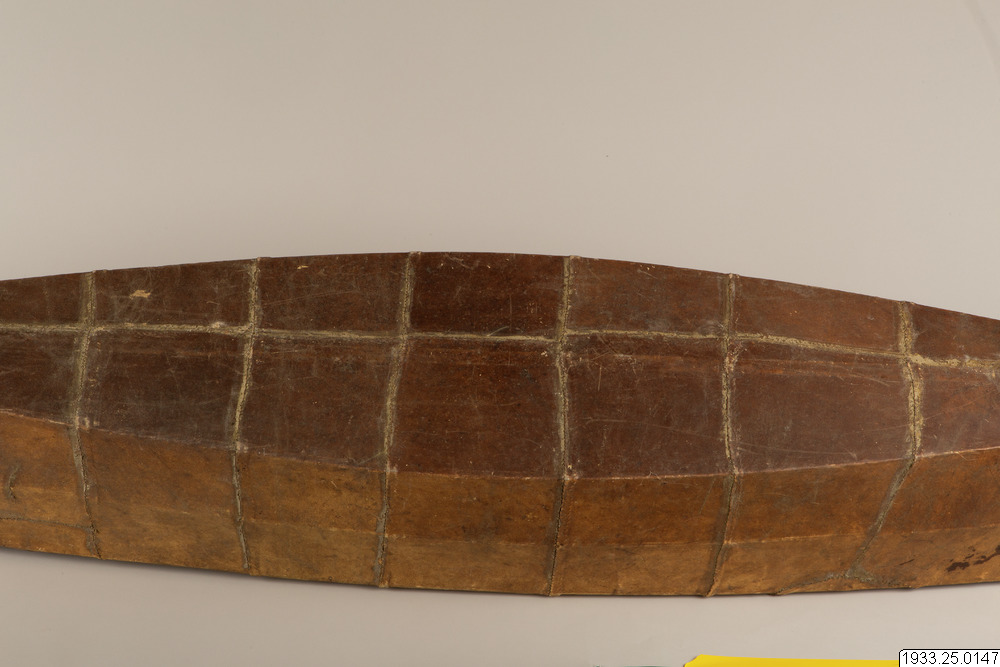 Kvinnobåt, "Umiak", modell. Båten består av sälhud spänd över ett träskelett. 11 bänkar, 4 rodderskor (nr 150), en styrare (nr 151), 6 åror (nr 148), 3 skinn och 1 segel (nr 149). Holstensborg, Västgrönland