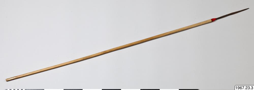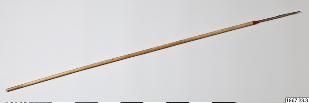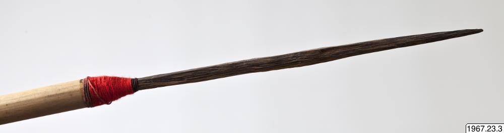 • Pil med skaft av bambuliknande material och pilspets av trä i form av en grovt tillspetsad sticka med endast en mycket svag markering mellan blad och tånge. Pilspetsen är instucken i skaftet och övergången mellan tånge och skaft är lindad med rött bomullsgarn. Skaftets övre ända är lindad med blått och rött bomullsgarn. Här sitter resterna av en liten, rödbrun fjäder.