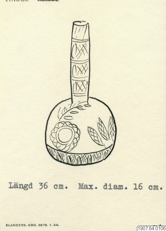 Kabák från Cypern, ett slags kalebass. Utst.kat. nr 4. Etikett: Kaback. Cypern. Medina 1907. Kulformig med långt, cylindriskt stjälkparti. Mynningen på platsen för stjälken. Inskuren geometrisk linjedekor och cirklar. Längd 36 cm. Max. diam. 16 cm. (generalkatalog).