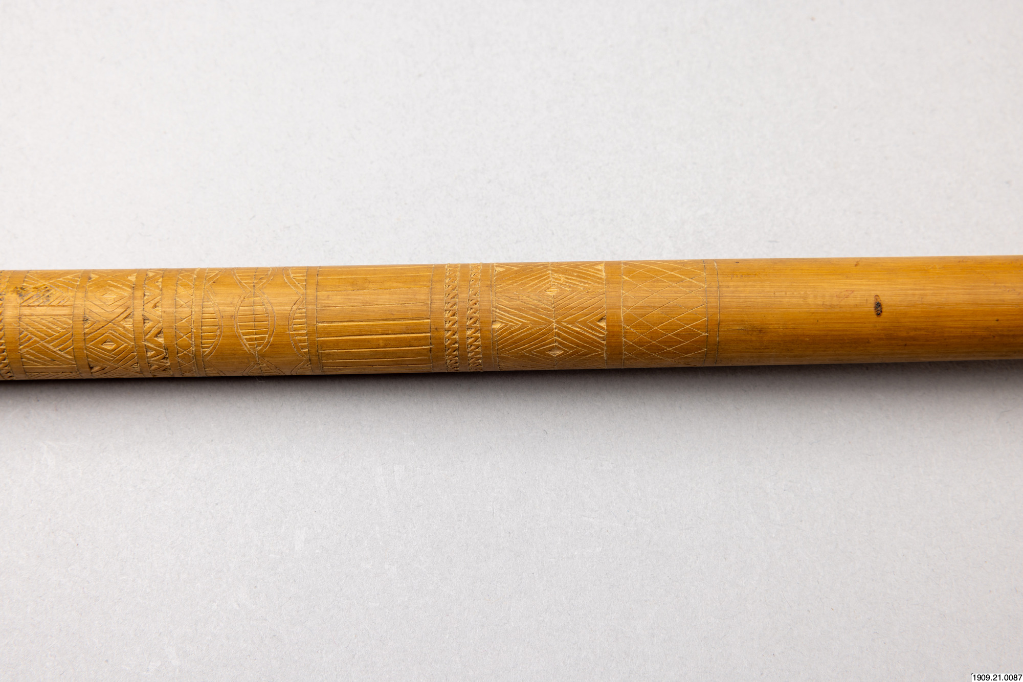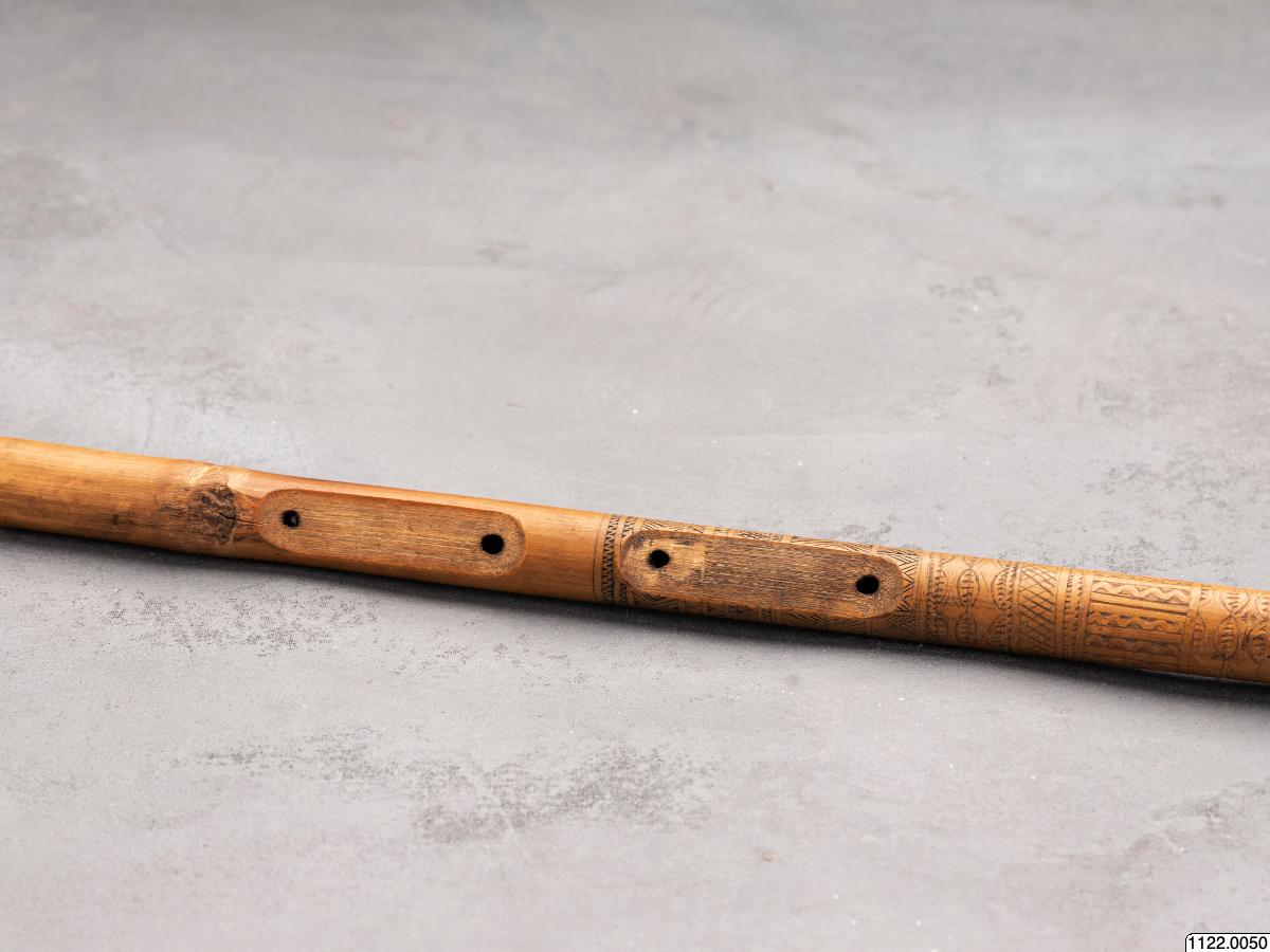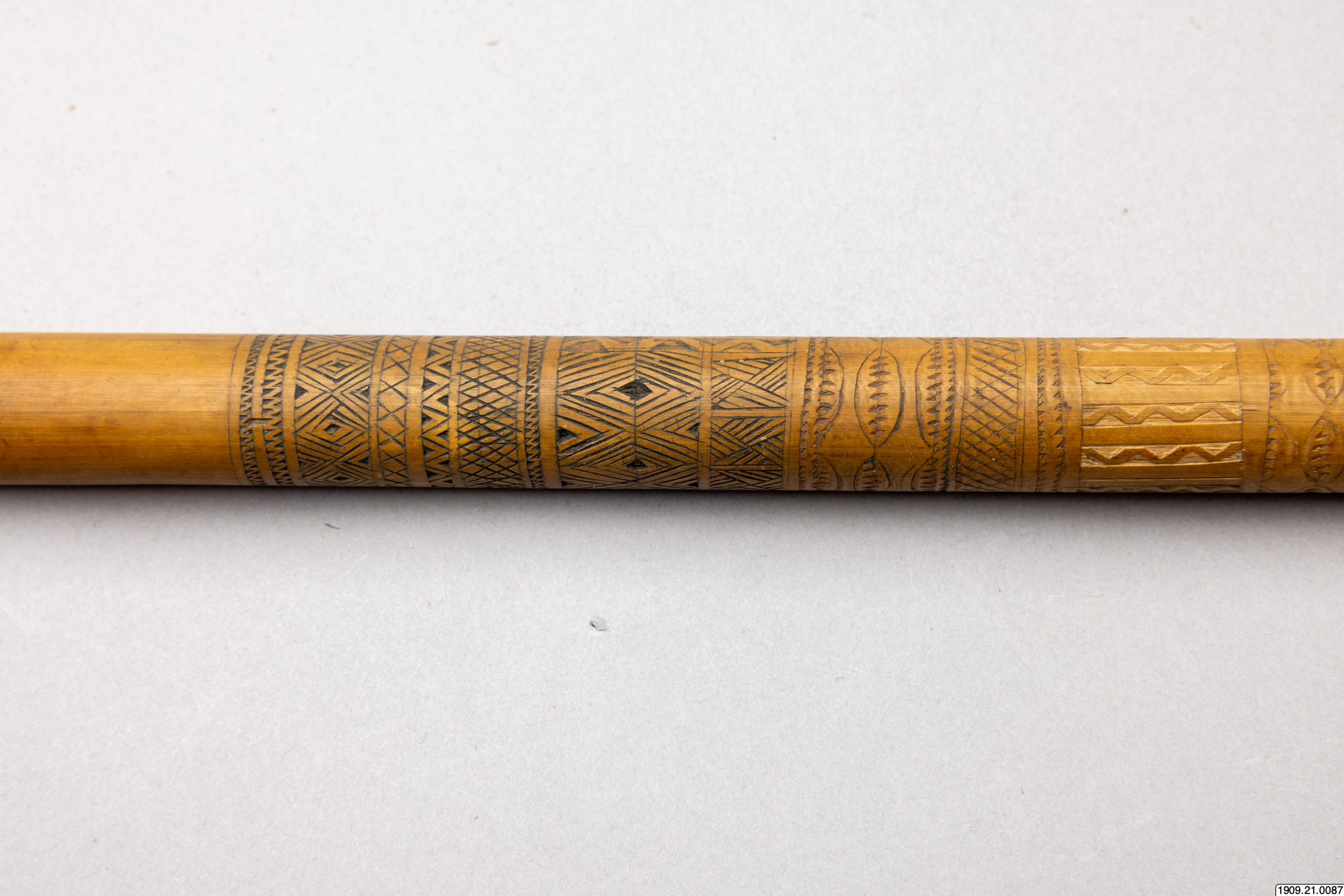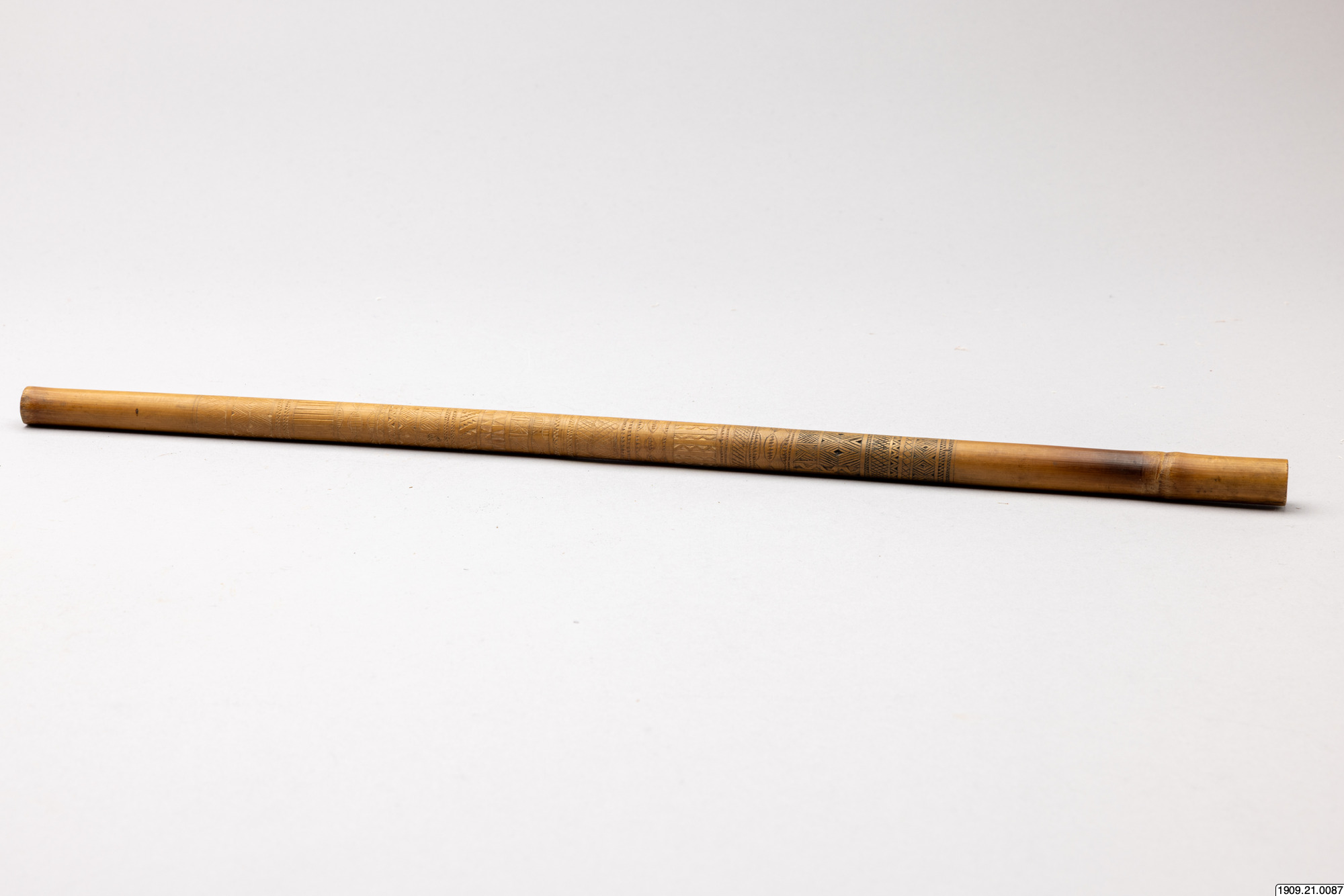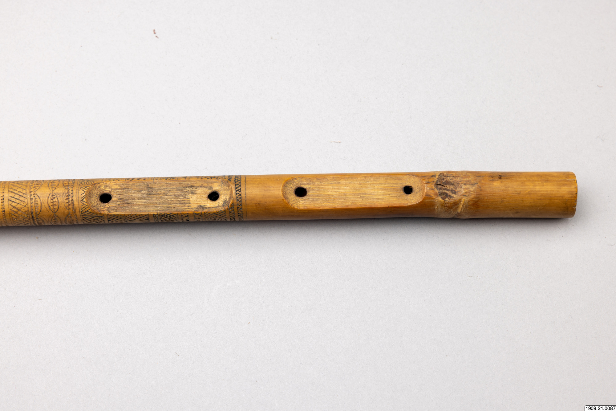 • Flöjt av bambu, prydd med rika sniderier. Chachasoa, Paiwaugruppen.