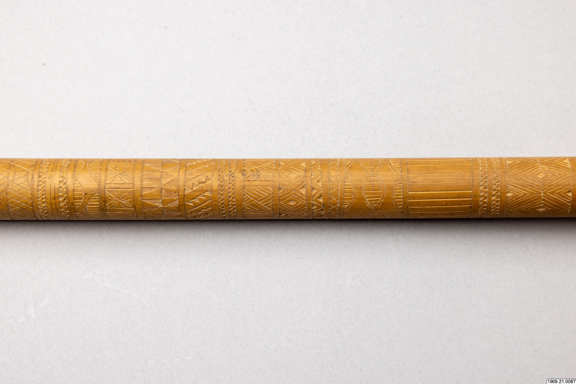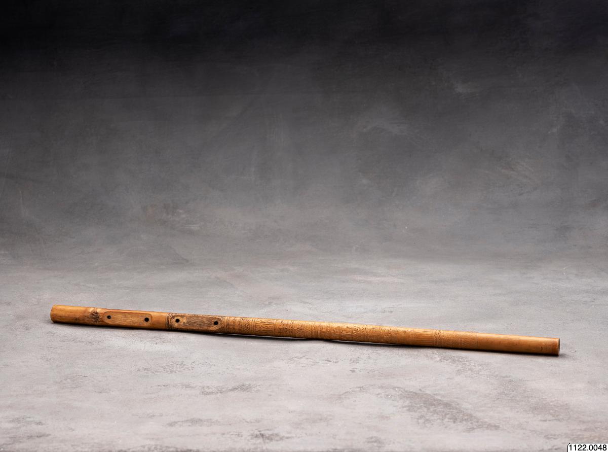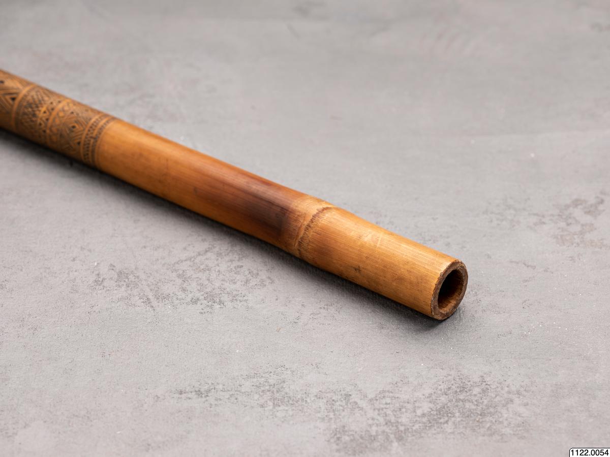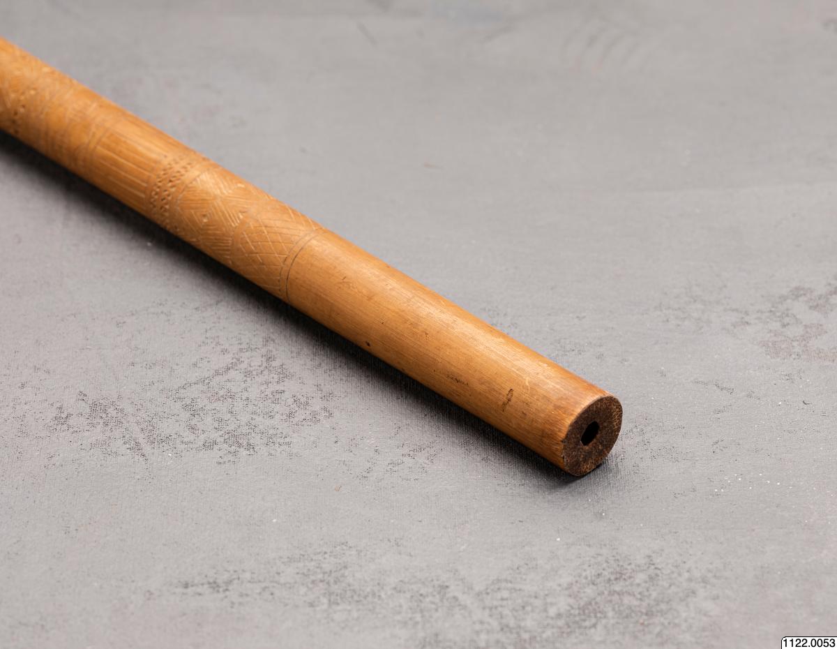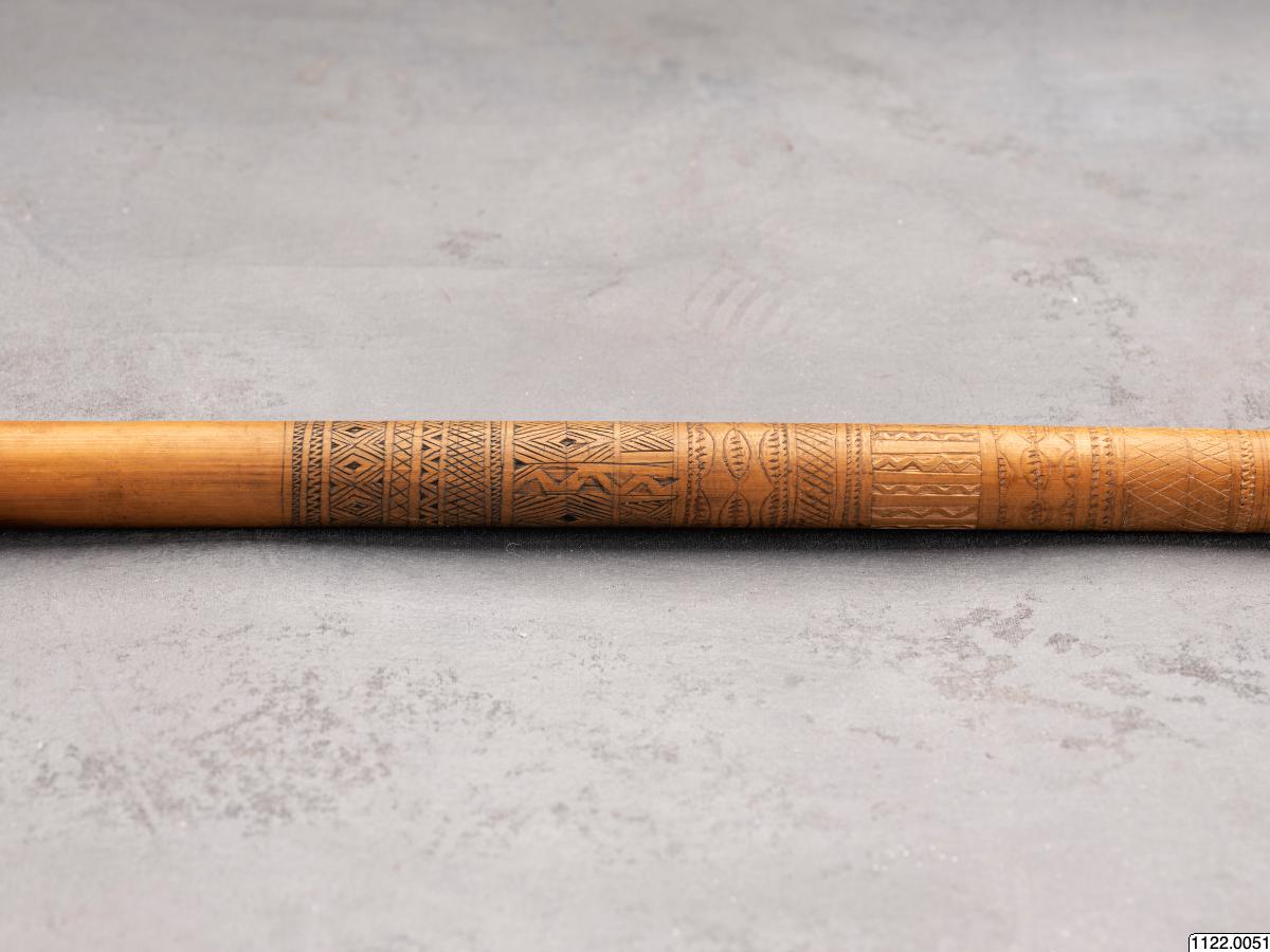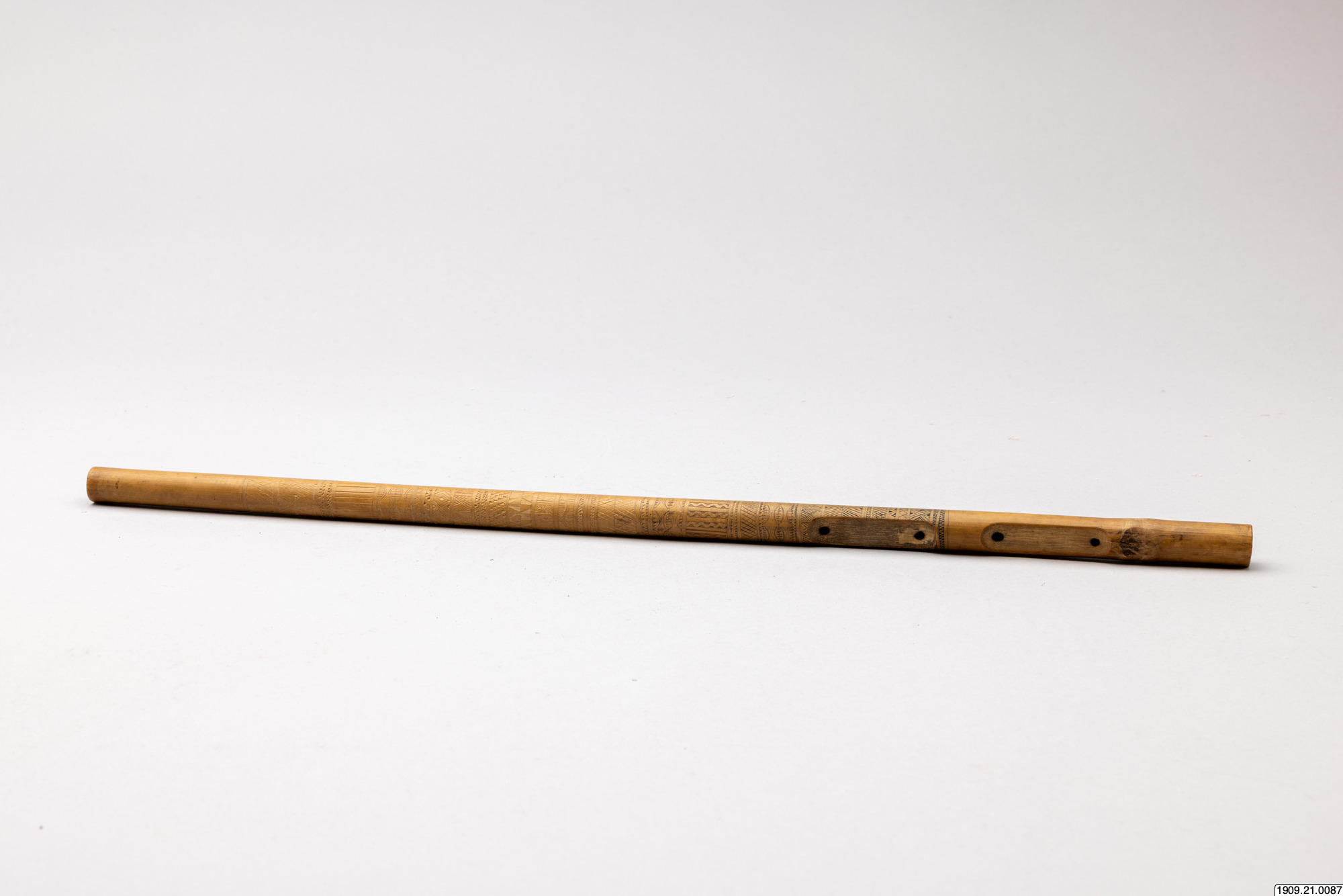 • Flöjt av bambu, prydd med rika sniderier. Chachasoa, Paiwaugruppen.