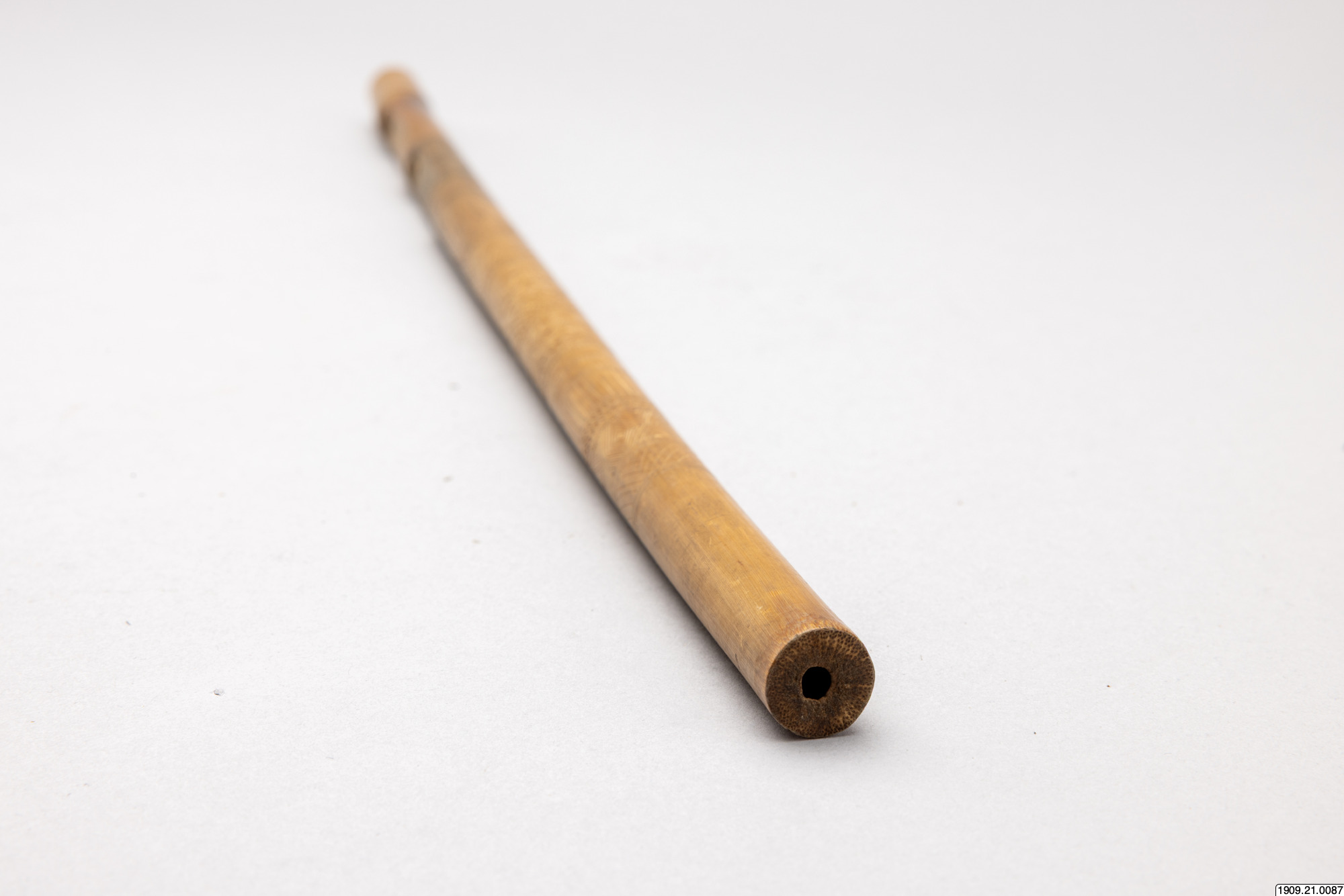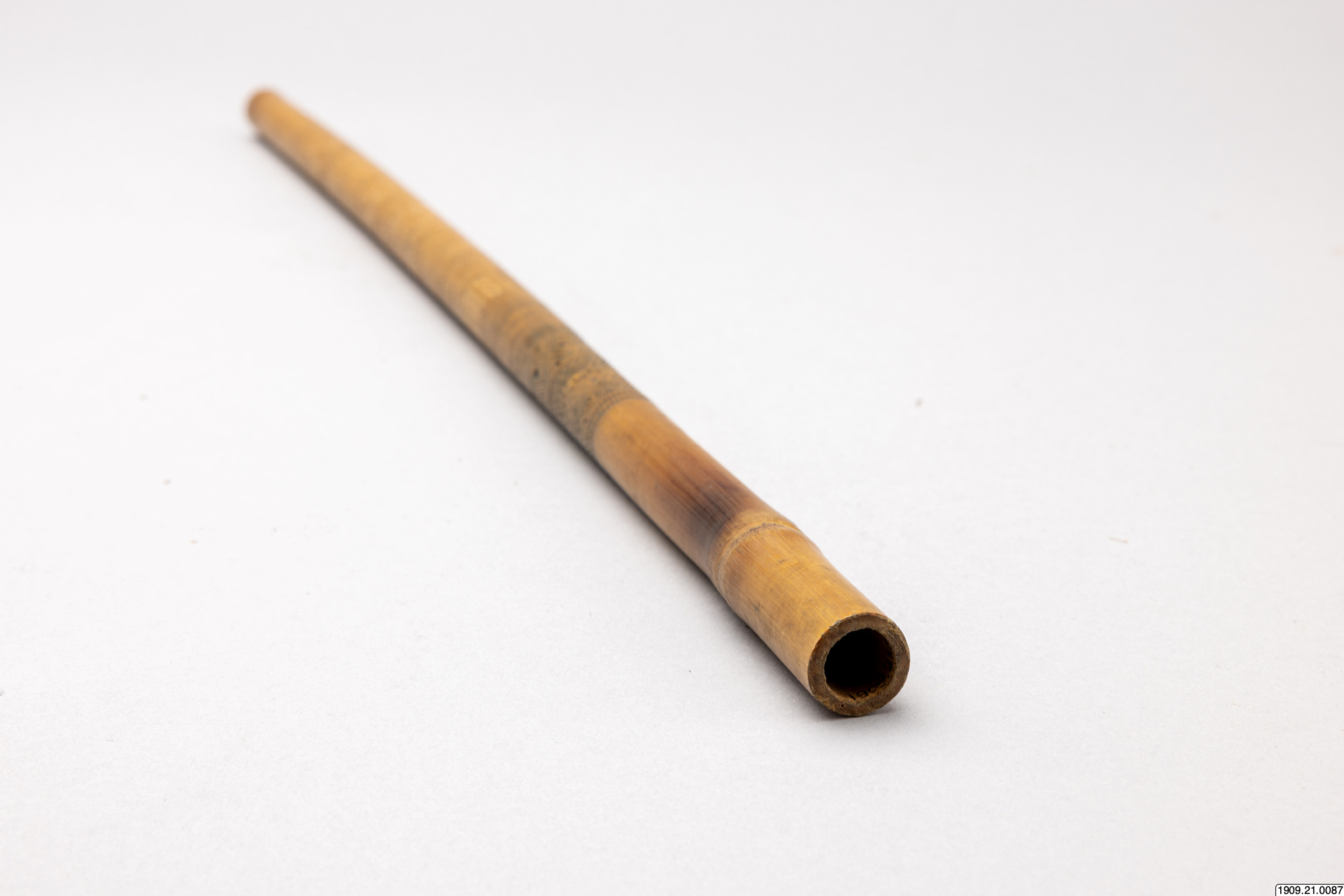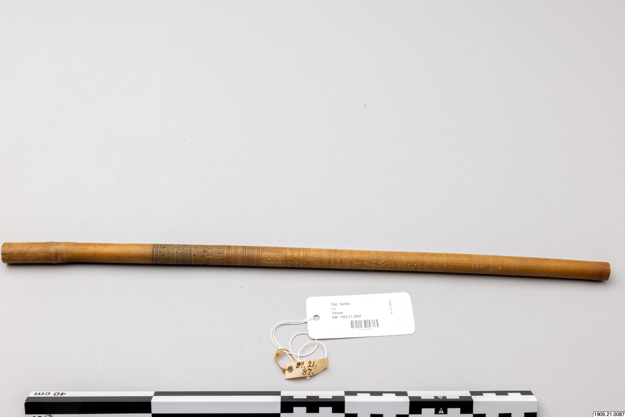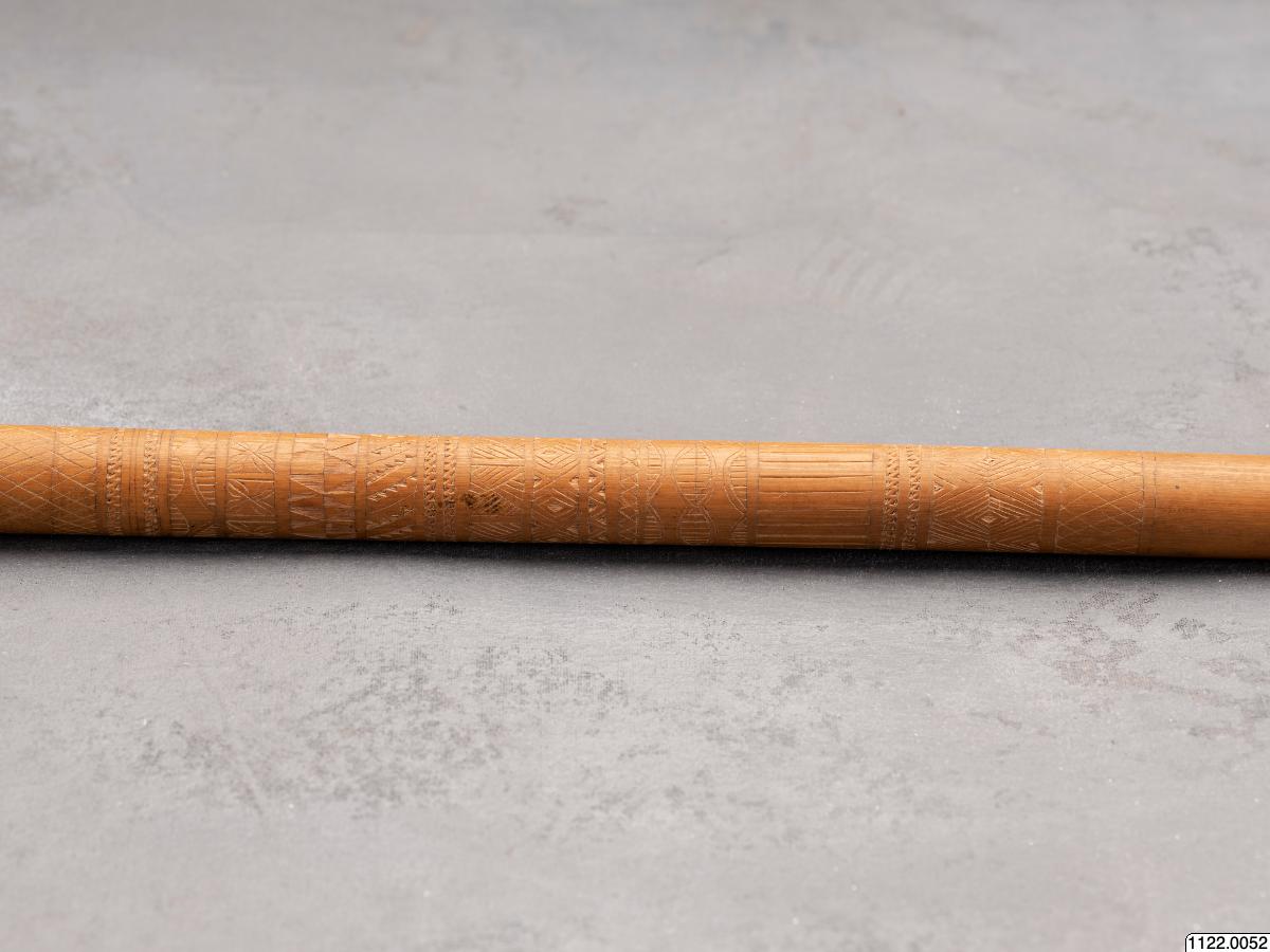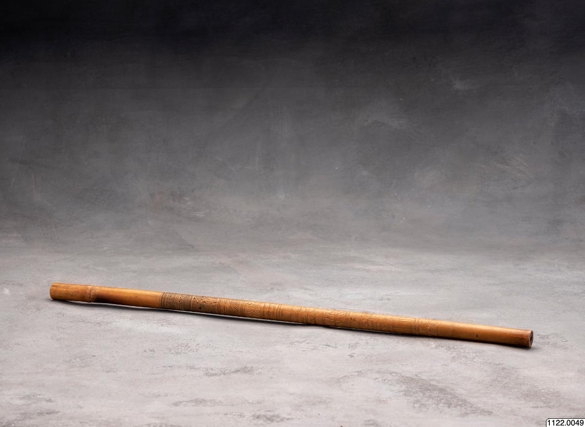 • Flöjt av bambu, prydd med rika sniderier. Chachasoa, Paiwaugruppen.