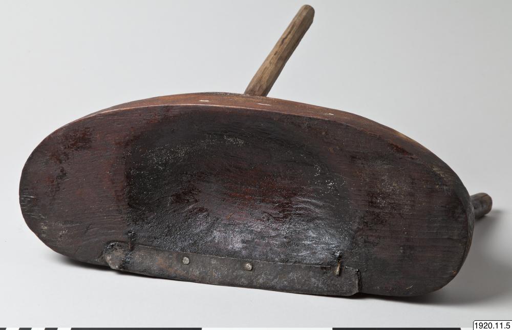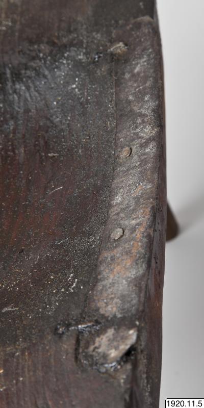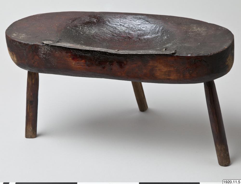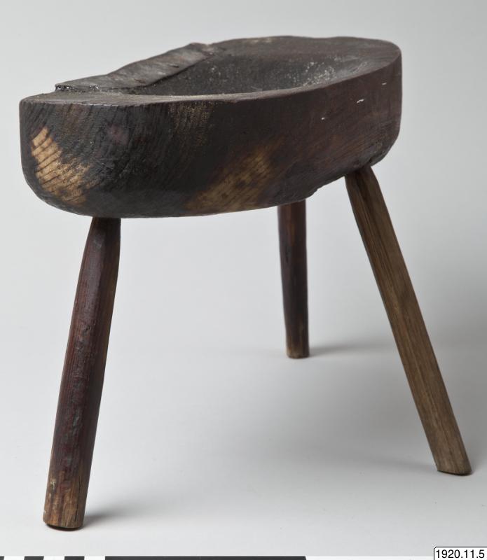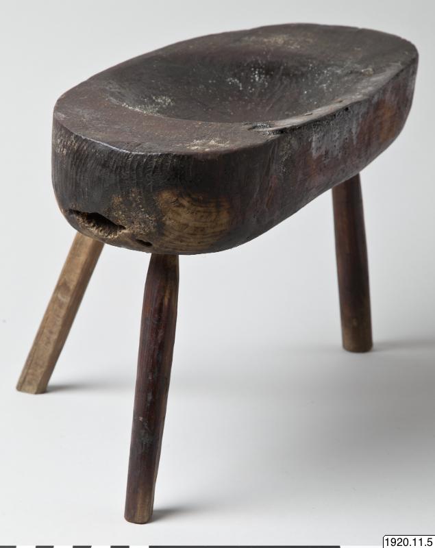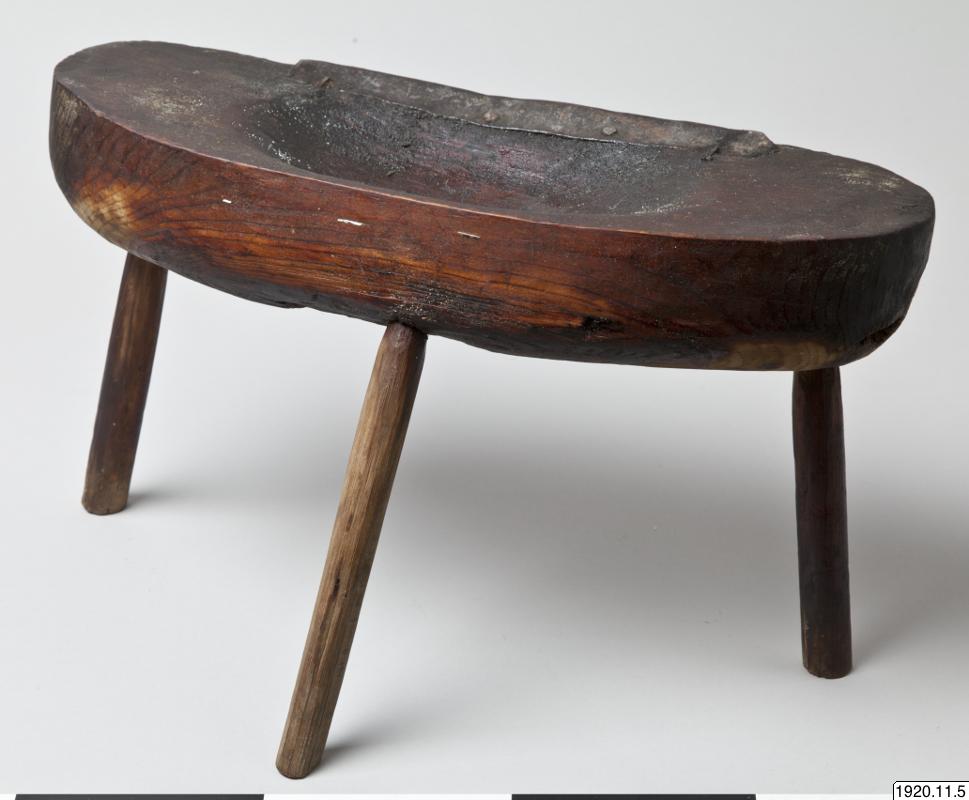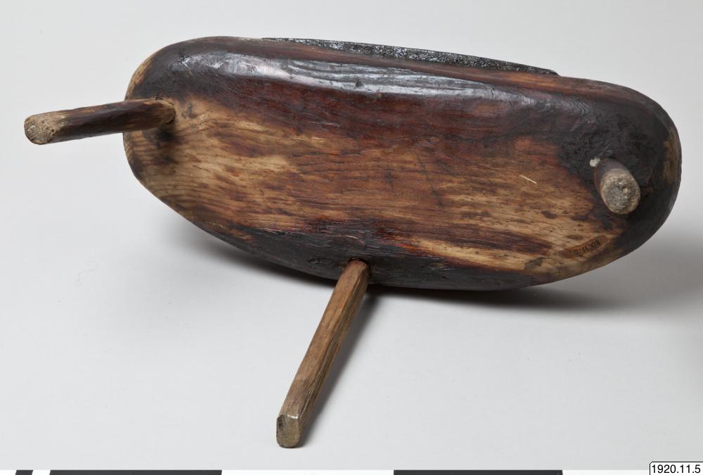 Ställ till tranlampa se nr 4, av trä. Består av en tjock bräda av samma form som lampan och försedd med tre ben av trä. I mitten en urholkning, i vilken spillolja samlas. Längs den rakare långsidans mittparti är en järnskena fäst. 40,5 x 16 cm. Höjd: 23,5 cm. Egedesminde. Väst-Grönland. (generalkatalogen).