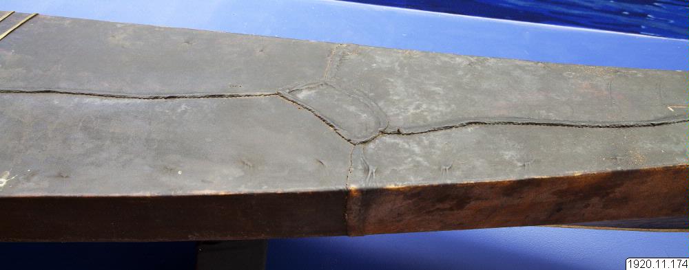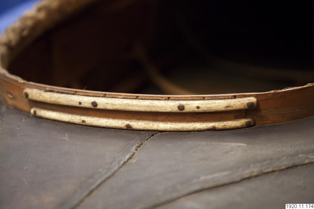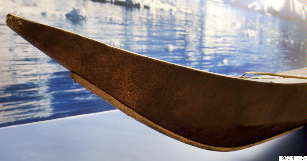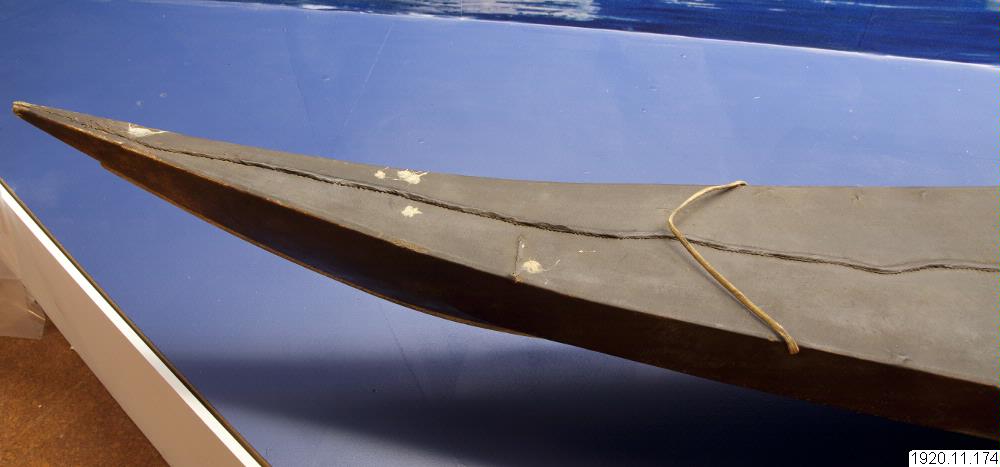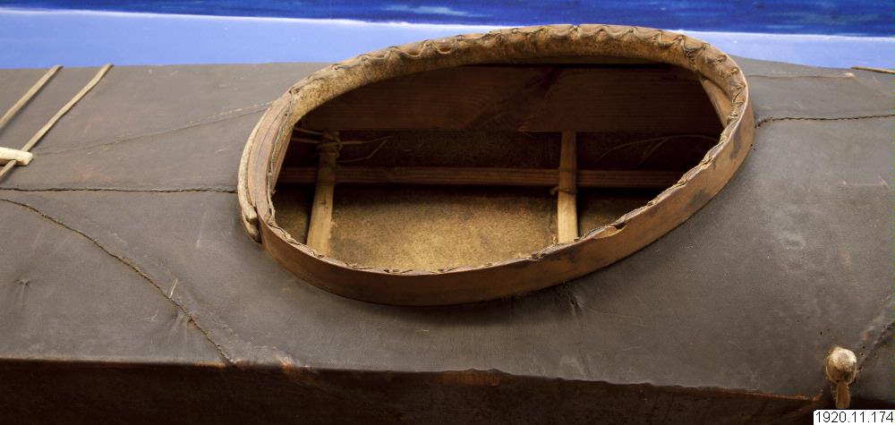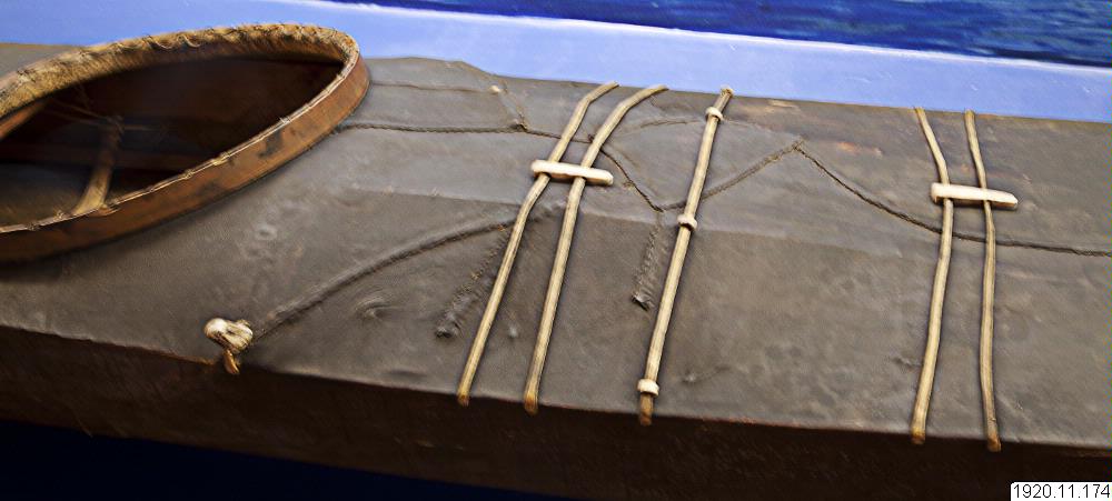Greenland kayaks [1920.11.0172, 1920.11.0174] riding at ease on the water of inlet behind Ethnographical Museum. In foreground boys craft [1920.11.0172], length 8 feet, max breadth 10", depth 6". Thorild Wulff Collection. (Nykvist 1961:89)