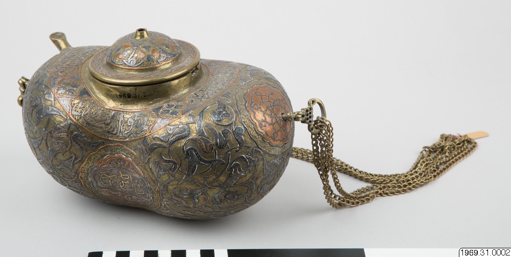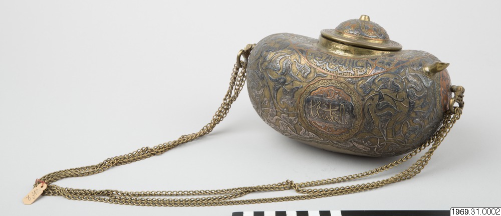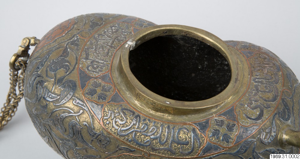 Dervish bowl in brass, with copper and silver inlays. On the outside, decorations and Arabic calligraphy can be seen. Dervish means poor in Persian and it is a concept used for members of different Muslim Sufi orders or brotherhoods. One of the most well-known Sufi orders is the dancing Mevlevi Dervishes from Turkey, who ritually whirl to flute music. In Arabic, Sufis may be called Fakir, which simply means poor. Needing to ask for help creates humility. The bowl, which also has a spout, is used for carrying water and begging for alms.