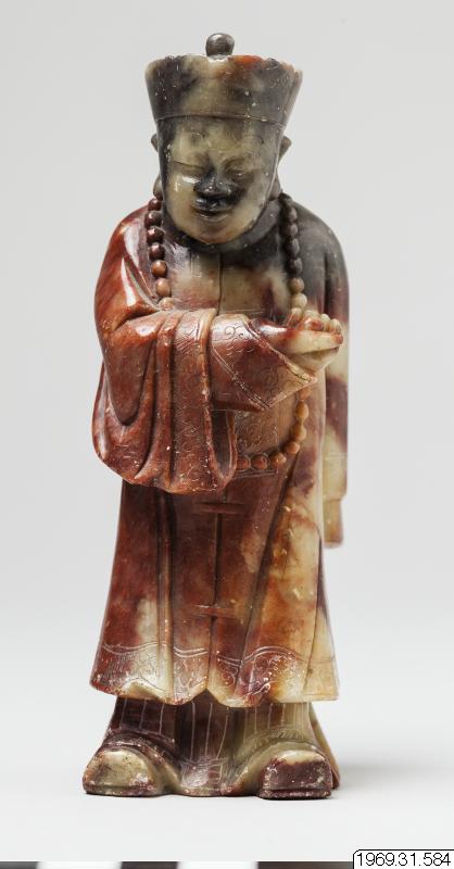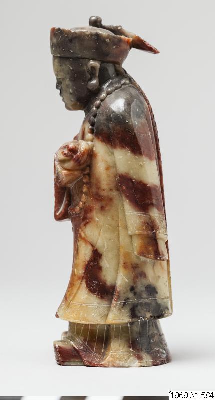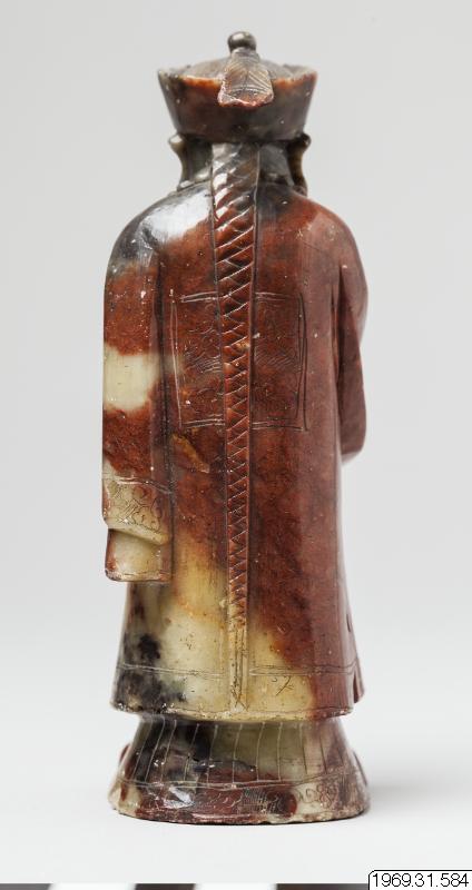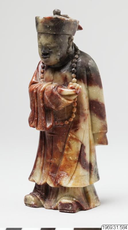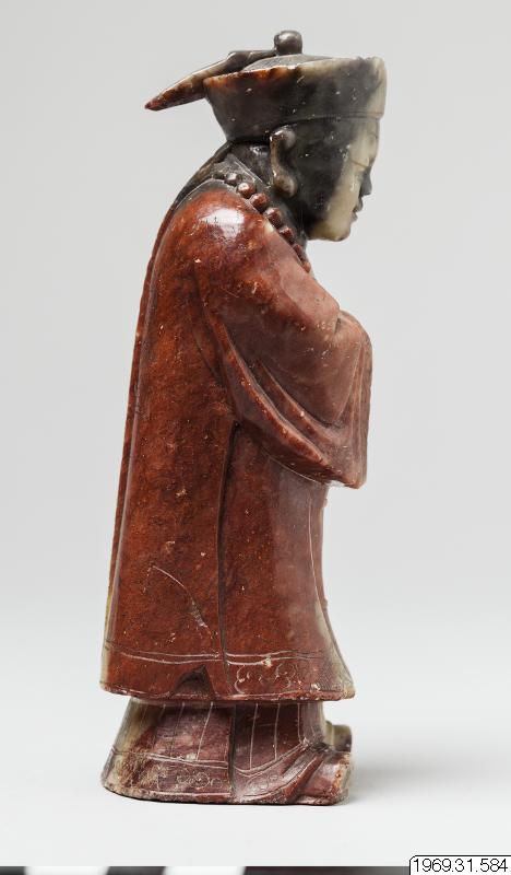 • Liten skulptur föreställande man i traditionell dräkt. Röd marmor?