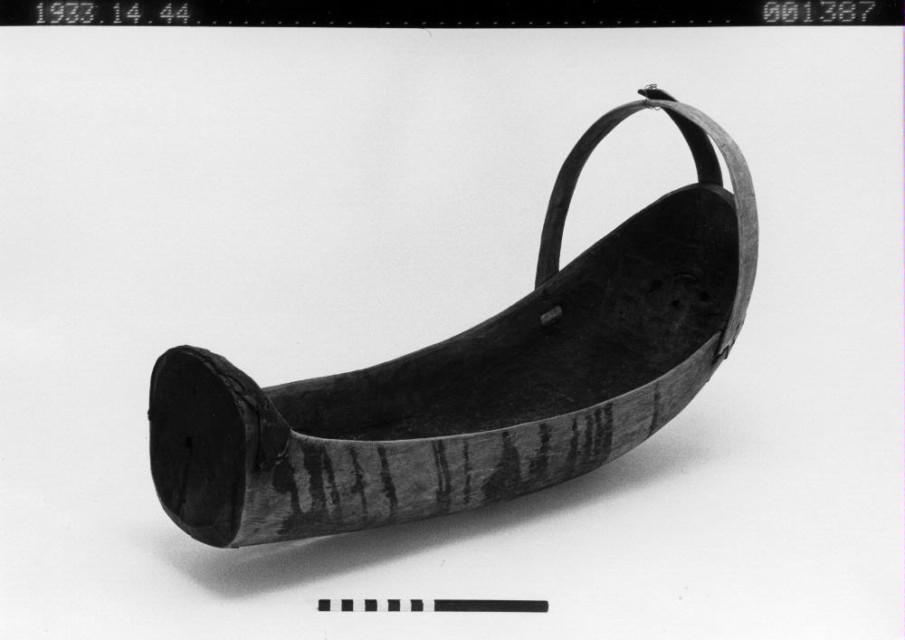 Vagga, oklädd, kietka. Av gran med huvbågar av björk. Bakre änden delvis beslagen med läder, lagning. Nikolaus Mangi.