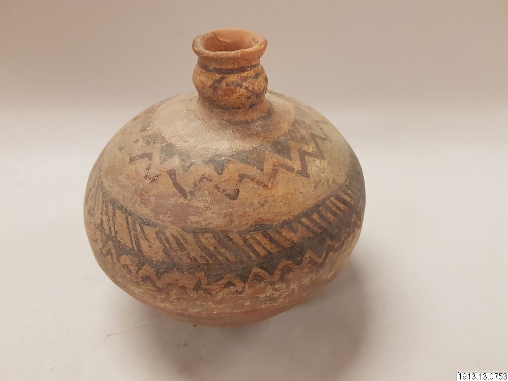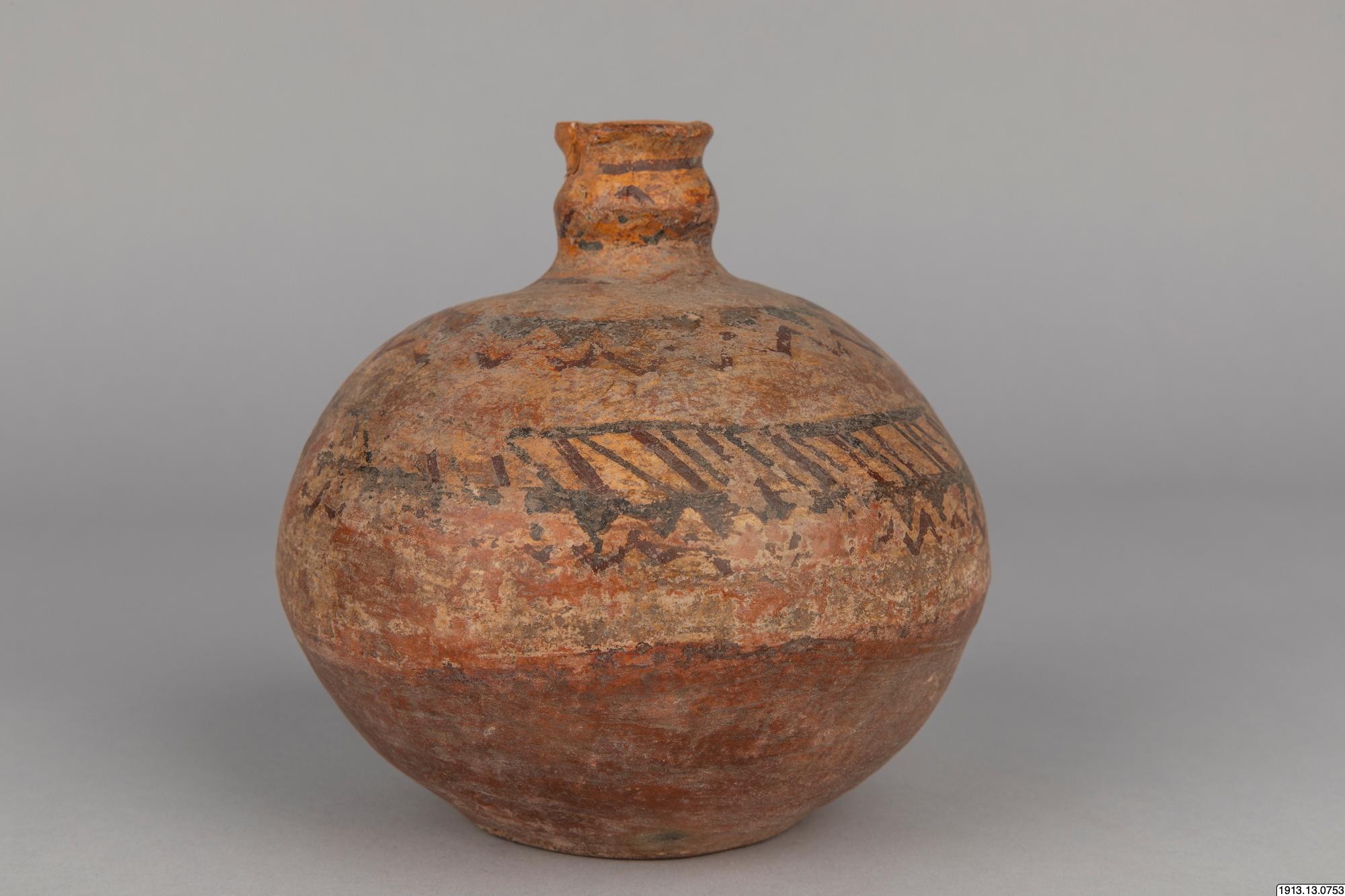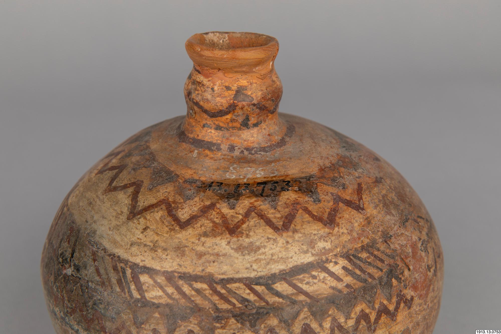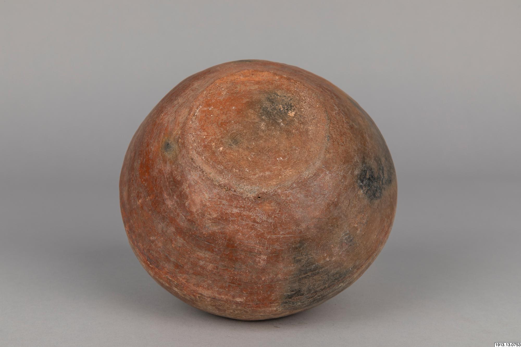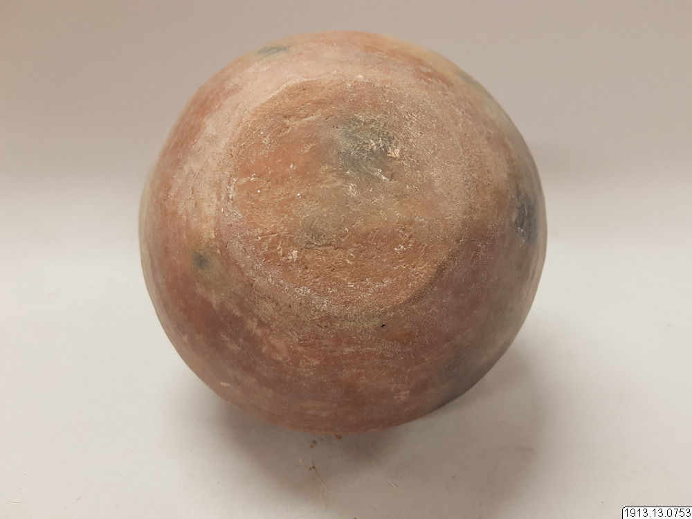 • Generalkatalog sidan 184. Lerkärl. Av brunt gods. Klotrund form med liten plan bottenyta och litet profilerat mynningsparti. Övre delen av yttersidan täckt av ett vitt färglager med målad dekor i två ... Visa hela