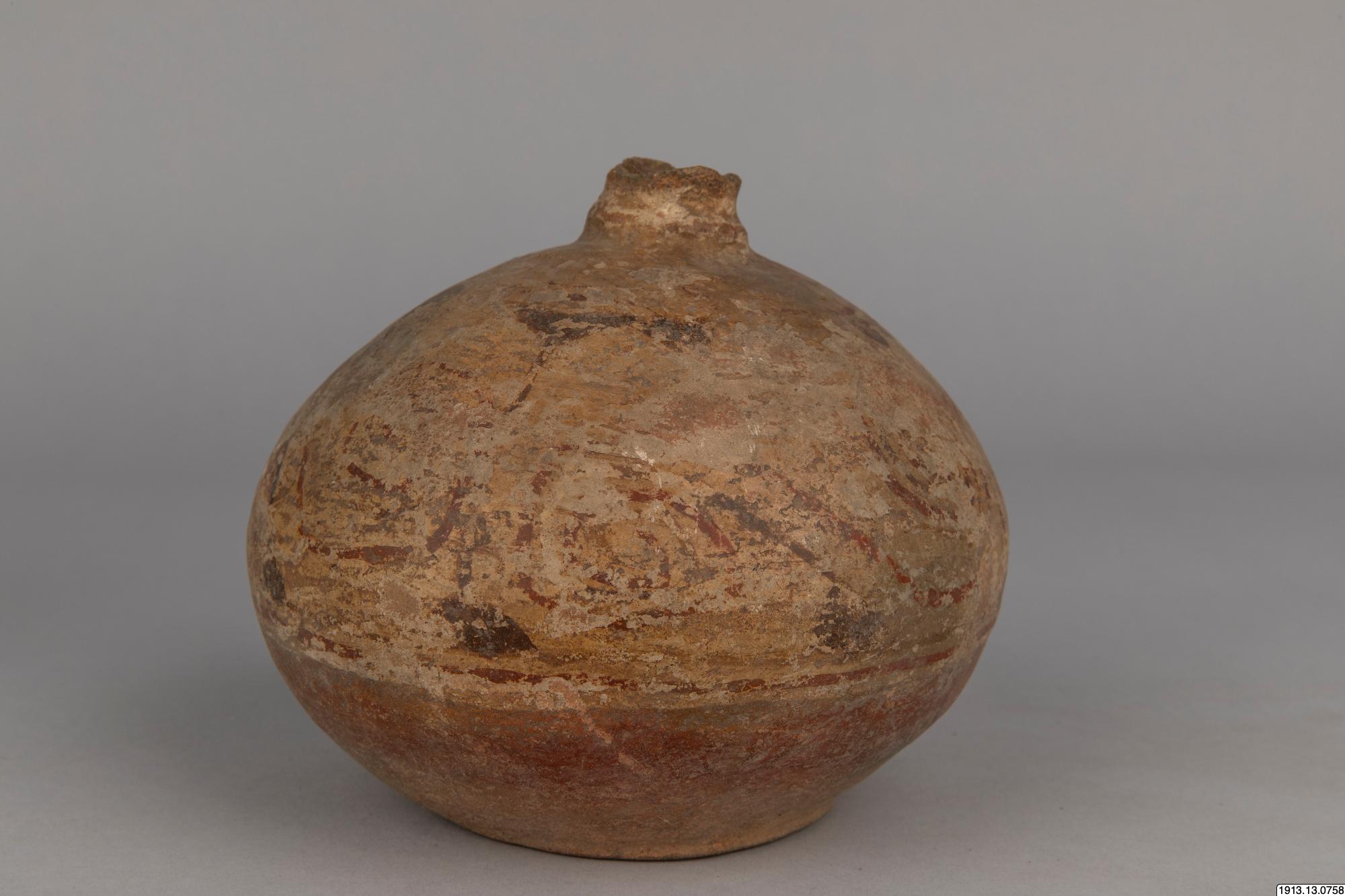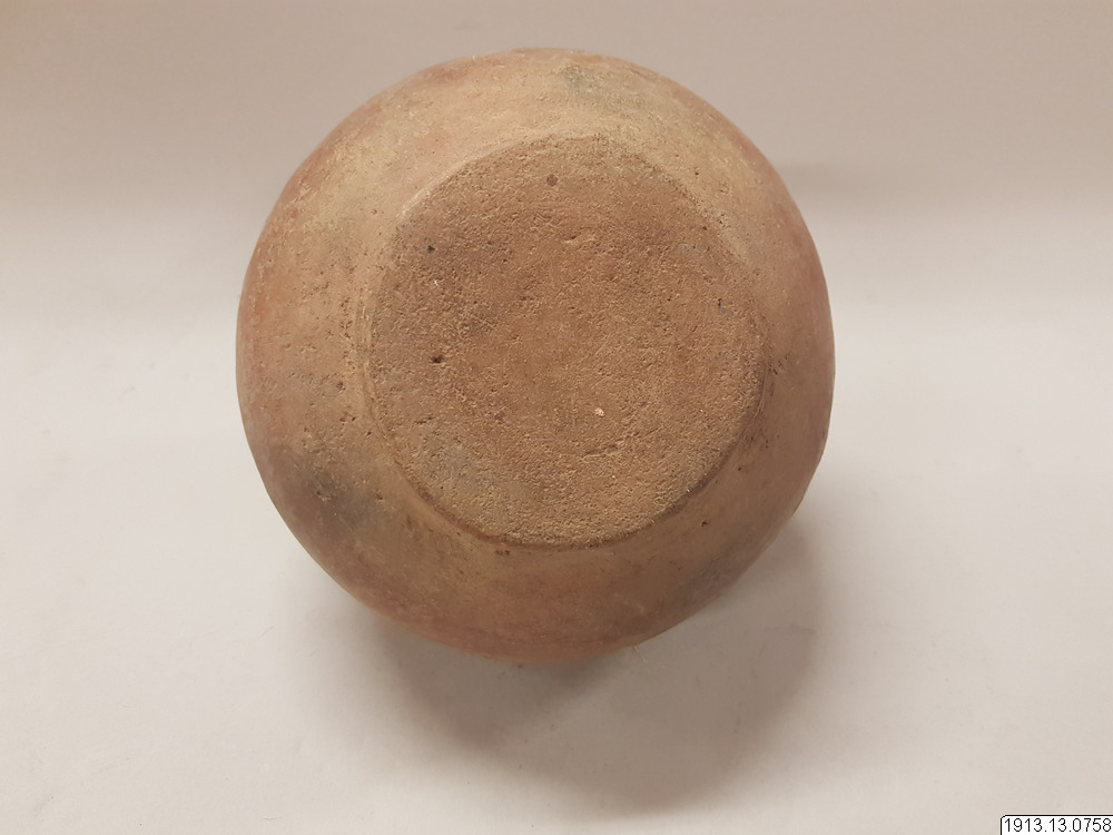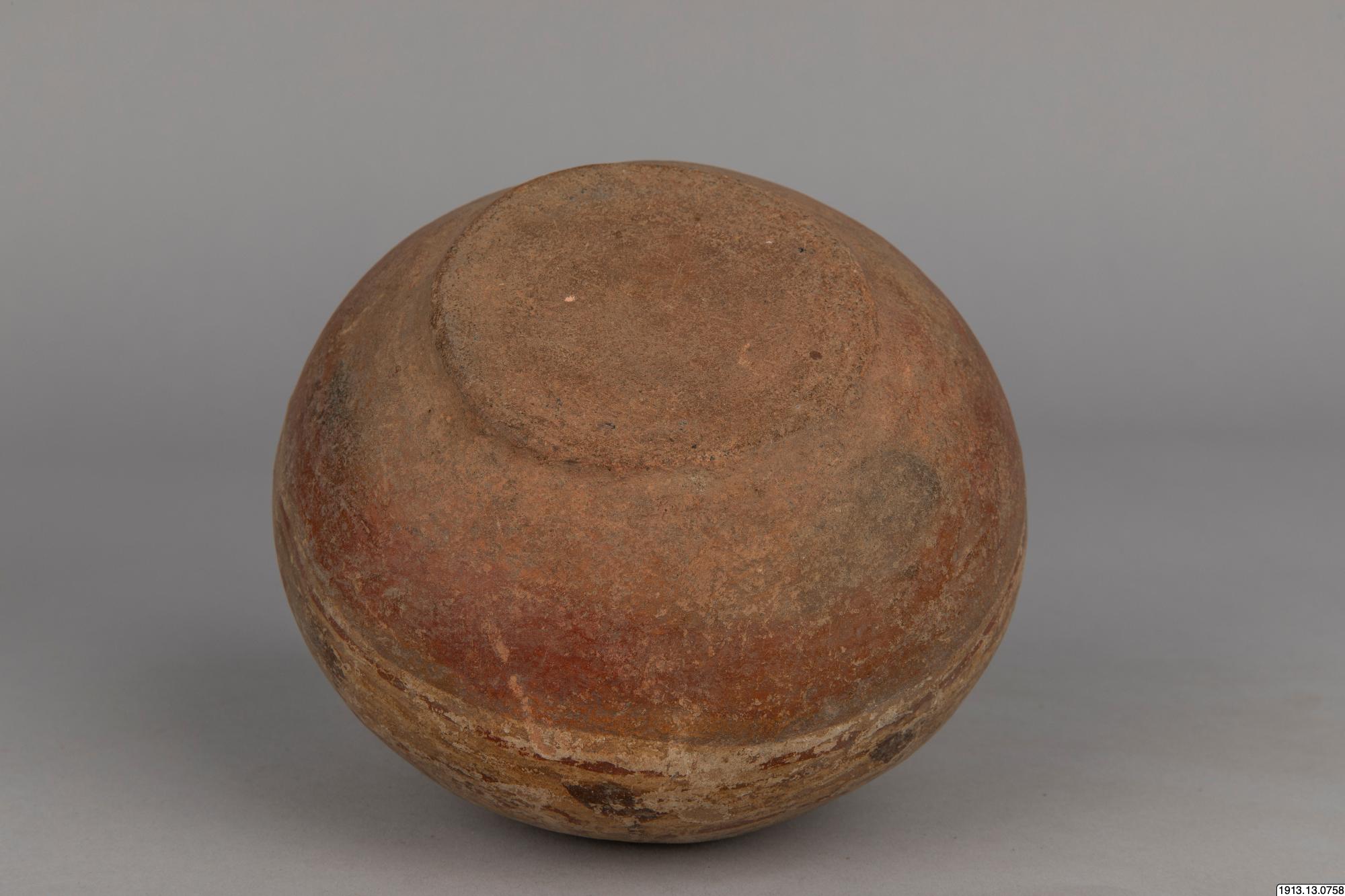 Generalkatalog sidan 185. D:o. (Lerkärl). Av brunt gods. Närmast klotrund form med plan bottenyta och lågt profilerat mynningsparti. Mynningskanten naggad. Övre delen överdragen med ett vitt täckande färglager med dekor i svart och rödbrunt. Detta färglager och dekoren dock mycket vittrad. Mynningskanten naggad. Höjd 14 cm. Max.diam. 16 cm. Mynningsdiam. 2,5 cm. Kaipipendi.