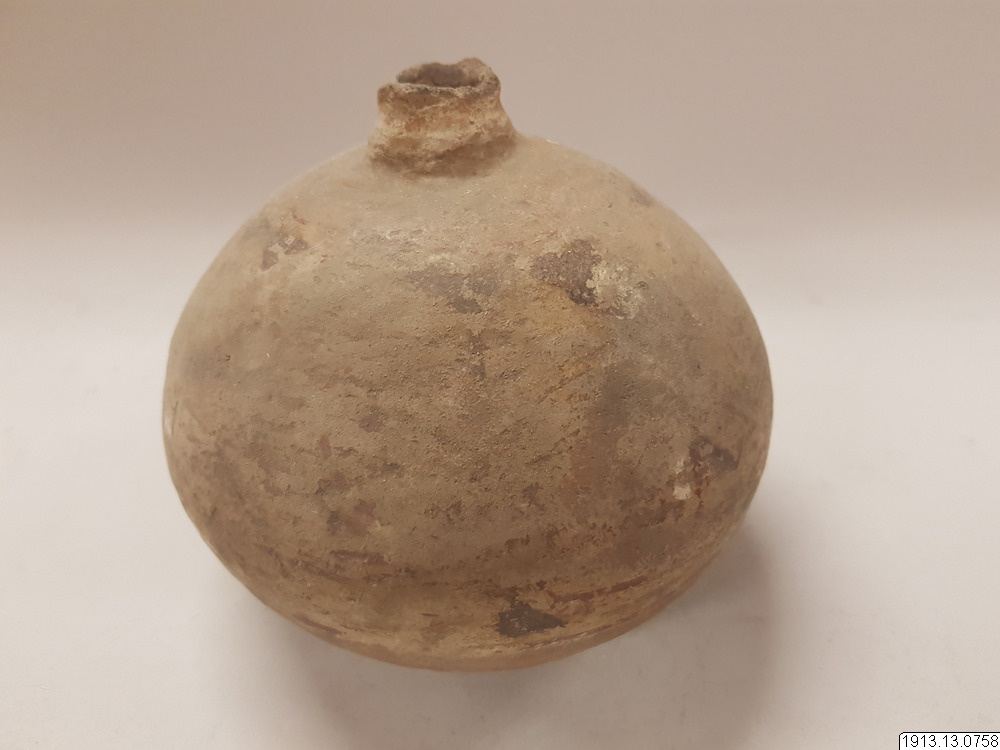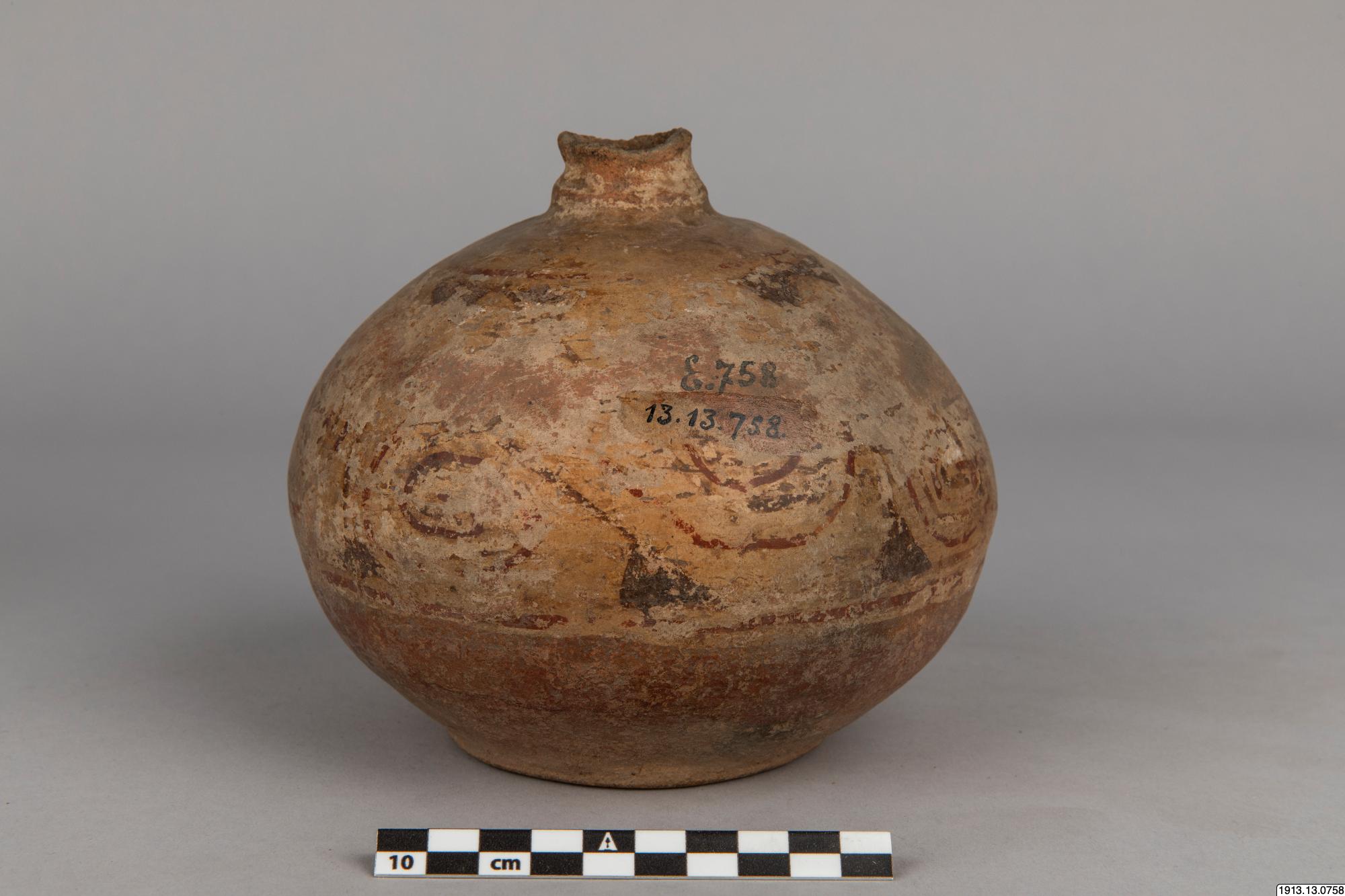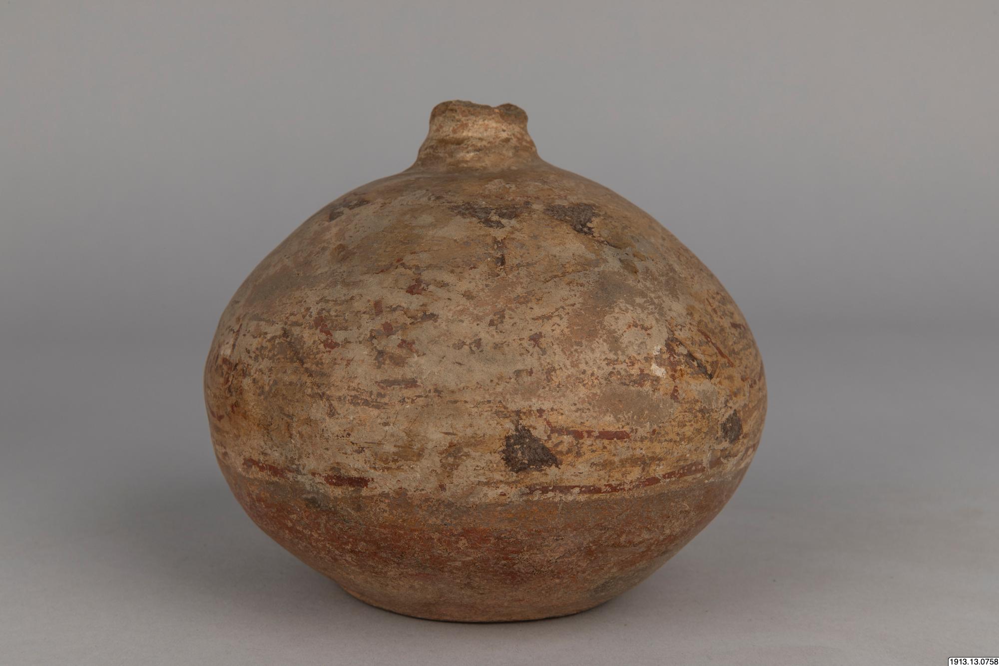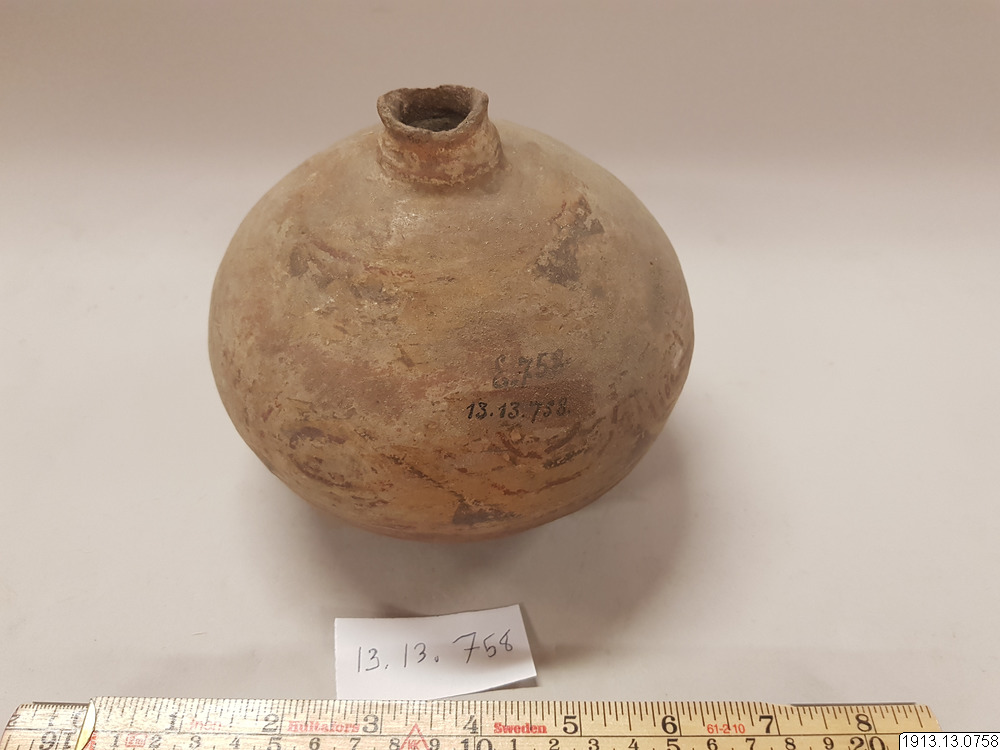 Generalkatalog sidan 185. D:o. (Lerkärl). Av brunt gods. Närmast klotrund form med plan bottenyta och lågt profilerat mynningsparti. Mynningskanten naggad. Övre delen överdragen med ett vitt täckande färglager med dekor i svart och rödbrunt. Detta färglager och dekoren dock mycket vittrad. Mynningskanten naggad. Höjd 14 cm. Max.diam. 16 cm. Mynningsdiam. 2,5 cm. Kaipipendi.