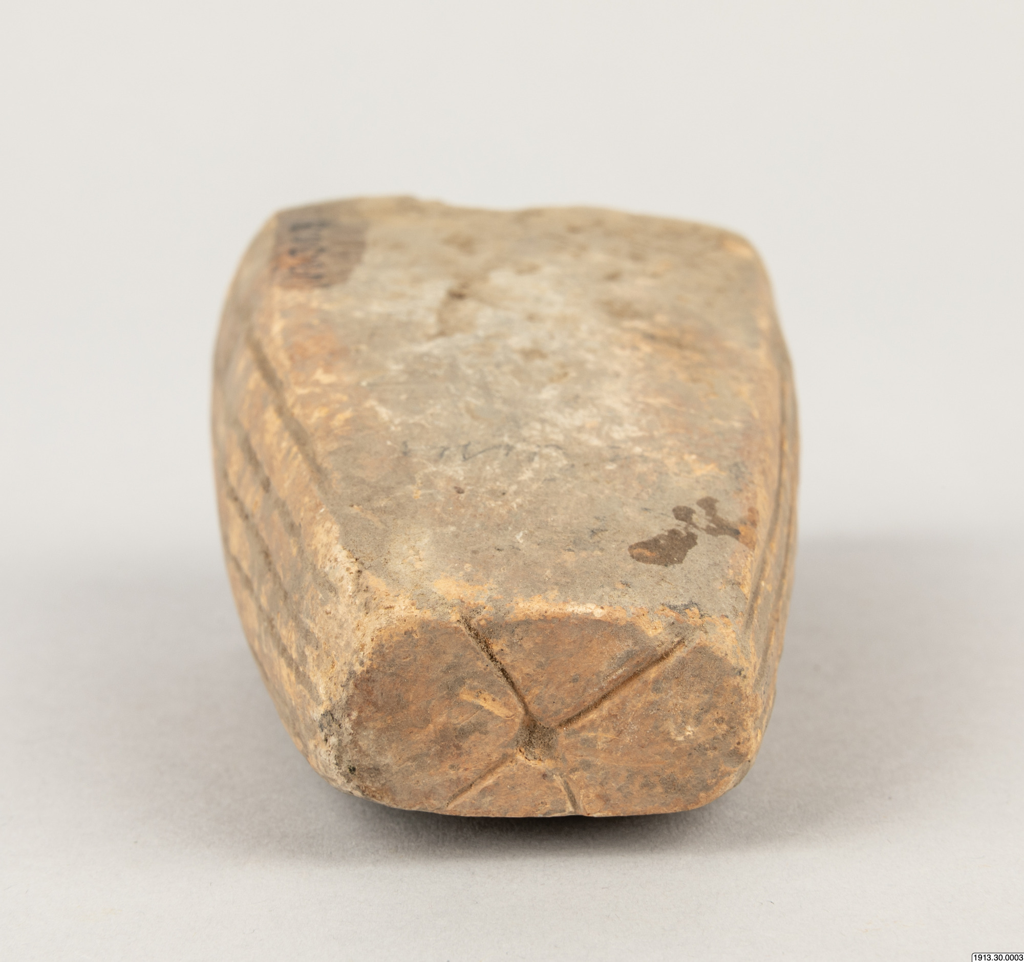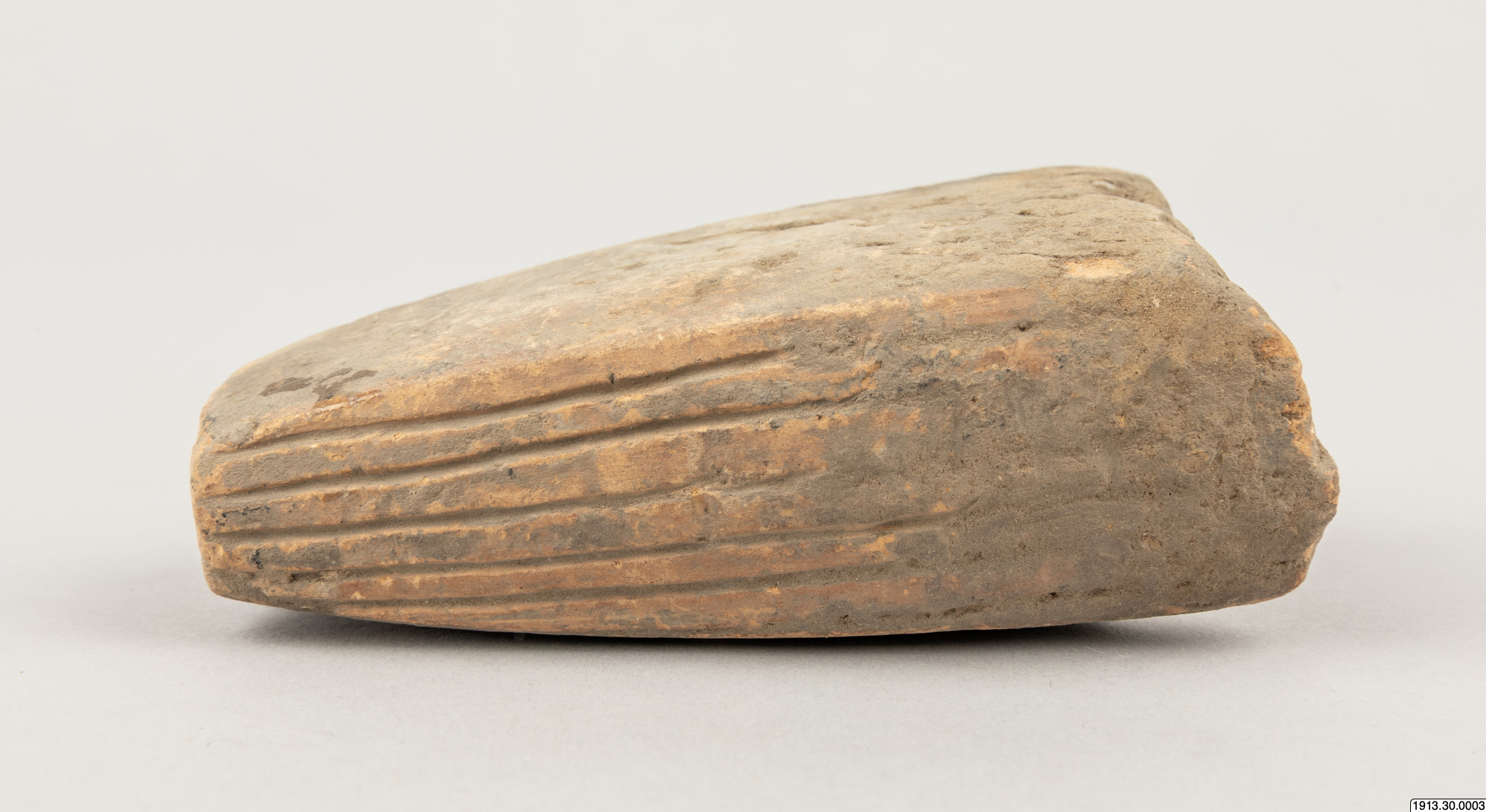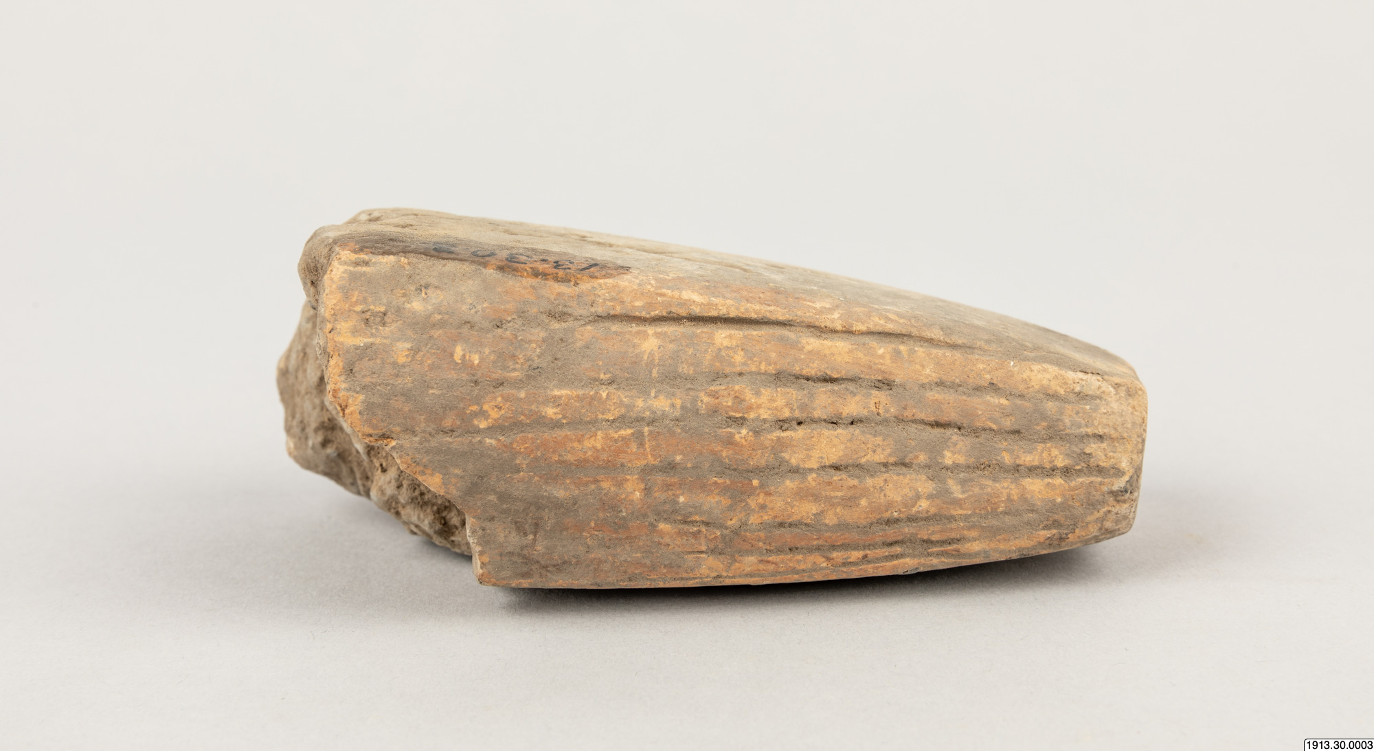 Malverktyg. Ändpartiet av en sliten, ursprungligen cylindrisk vals av brunt lergods med mörkare kärna. Ytan parallellrefflad, två planslitna malytor, som givit valsen ett mera fyrkantigt tvärsnitt. Utan nummer 1958 men påskrivet med blyerts "Los Cusis". Längd 10,5.cm. Tvärsnitt 4 x 6 cm Los Cusis.