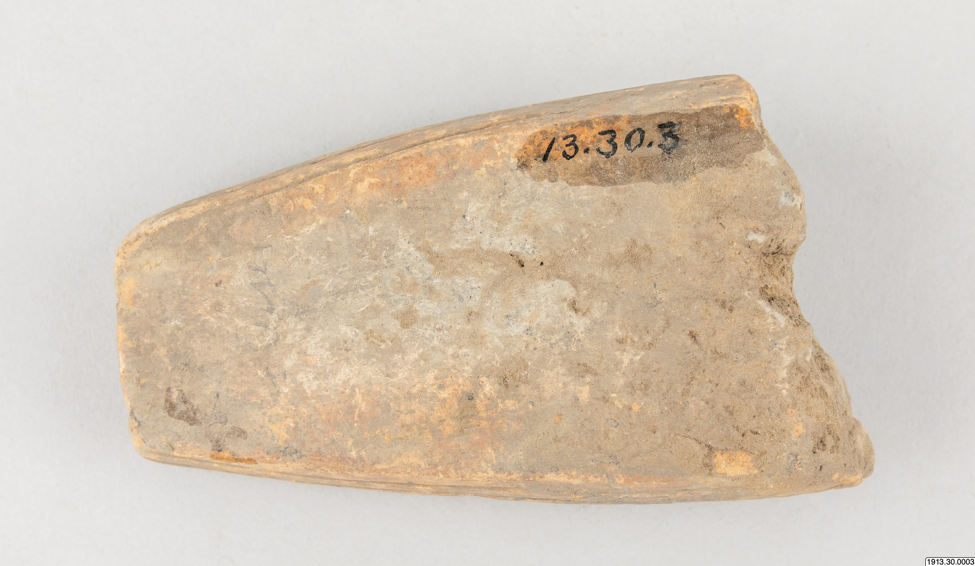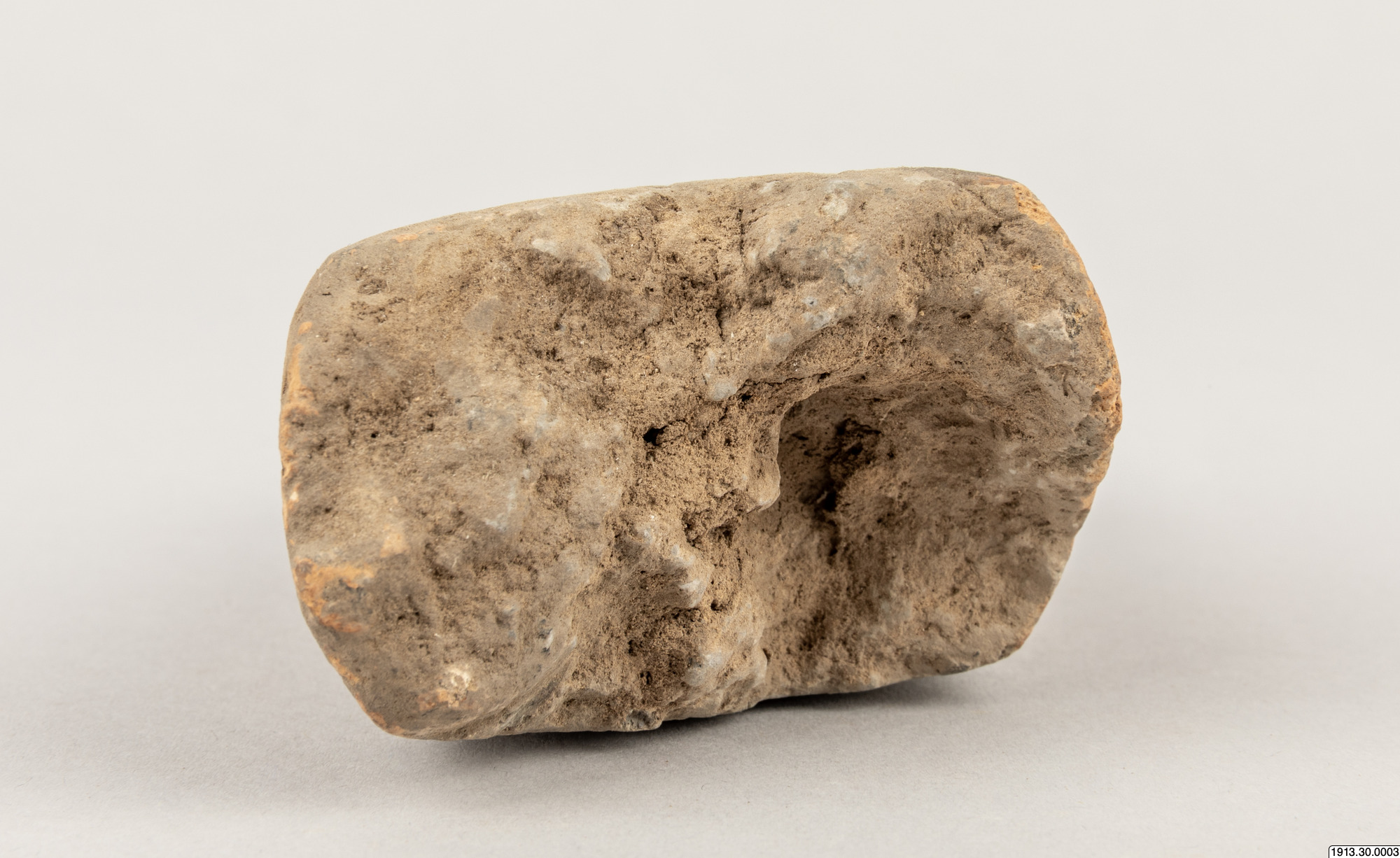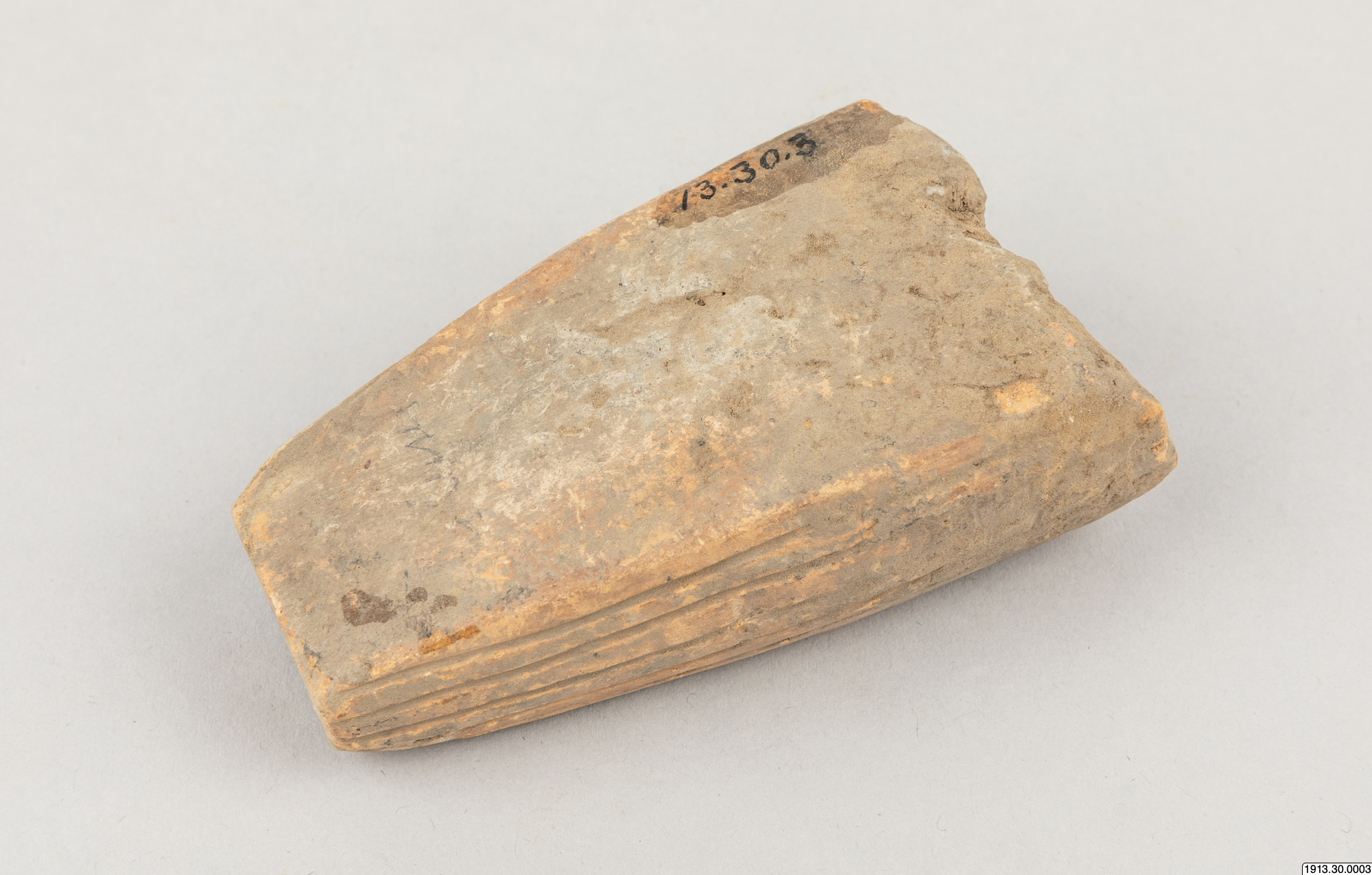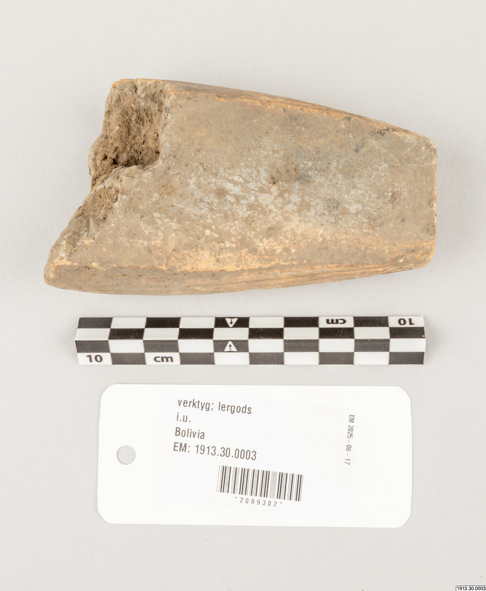 Malverktyg. Ändpartiet av en sliten, ursprungligen cylindrisk vals av brunt lergods med mörkare kärna. Ytan parallellrefflad, två planslitna malytor, som givit valsen ett mera fyrkantigt tvärsnitt. Utan nummer 1958 men påskrivet med blyerts "Los Cusis". Längd 10,5.cm. Tvärsnitt 4 x 6 cm Los Cusis.