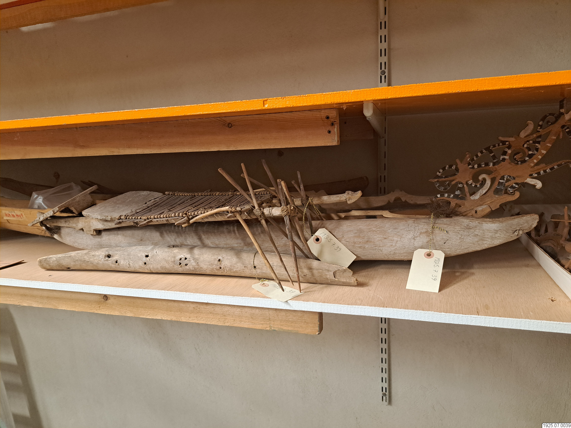 Båtmodell. Kanot med uteliggare. Själva kanoten är en urholkad trädstam, som är kalkad och har överböjd reling. 'Stävarna äro icke urholkade. Ovanpå vardera är skulpterad antagligen en klubba eller åra ovanpå något heligt tecken, (fig.). På ömse sidor, där urholkningen slutar, en liten omlindad tvärslå med en tofs av grova, bruna fibrer (kokos?)i var ända. Midskepps tvenne tofter. De kunna icke ha använt vid rodd, eftersom, de ligga alldeles under uteliggarebryggan.' Denna vilar på tvenne stänger, ytterst, slutande med knappar (en av dem avbruten). Uteliggarebryggan går på andra sidan Ut i en plattform, bildad av en kalkad bräda, bunden vid ytterknapparna med samma slags garn med grova bruna fibrer förut nämnt. Uteliggarebryggan vilar på relingen i skåror. Den börjar med en plattform av bräda, lik föregående, fortsättes med tätt hopbundna, smala ribbor och på lika avstånd tre tvärgående stänger, med knappar ytterst två inuti bryggan och en ytterst. Slutligen på fundamentstängerna fastbundna de x-formiga käpparna, som hålla uteliggaren. Uteliggaren är något böjd och kalkad. Kanotens längd: 1 m. 4 cm. Bredd: 8 cm. Uteliggarebryggan inklusive plattformen på motsatta sidan längd: 71 cm. Bredd: 17 cm. Uteliggarens längd: 64 cm. Bredd: 5 cm. (Jfr Inv. 1916.1.3196 utan proveniensupp gift.) Lokal oviss. Själva plattformen lik den på Santa Cruzöarna, men dess underrede går rakt ut och är ej bygel- formigt som där. Själva kanoten är en Santa Cruz-typ. . Santa Cruzöarna Oceanien