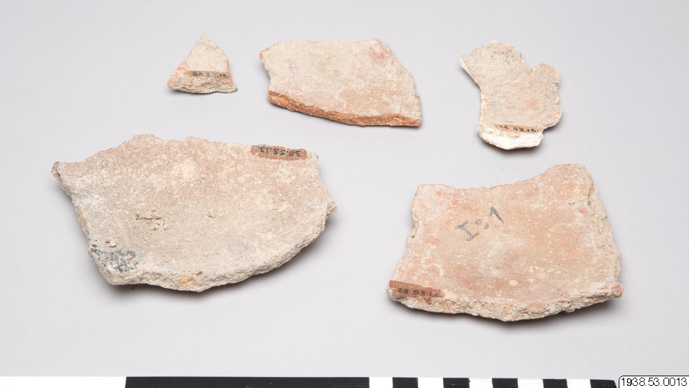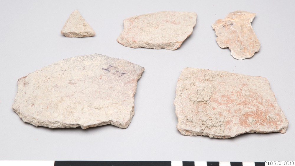 • Lerskärvor. 7 stycken, var av 3 har sammanfogats med adhesiv så att det blir 5 skärvor. Ej ornamenterade.