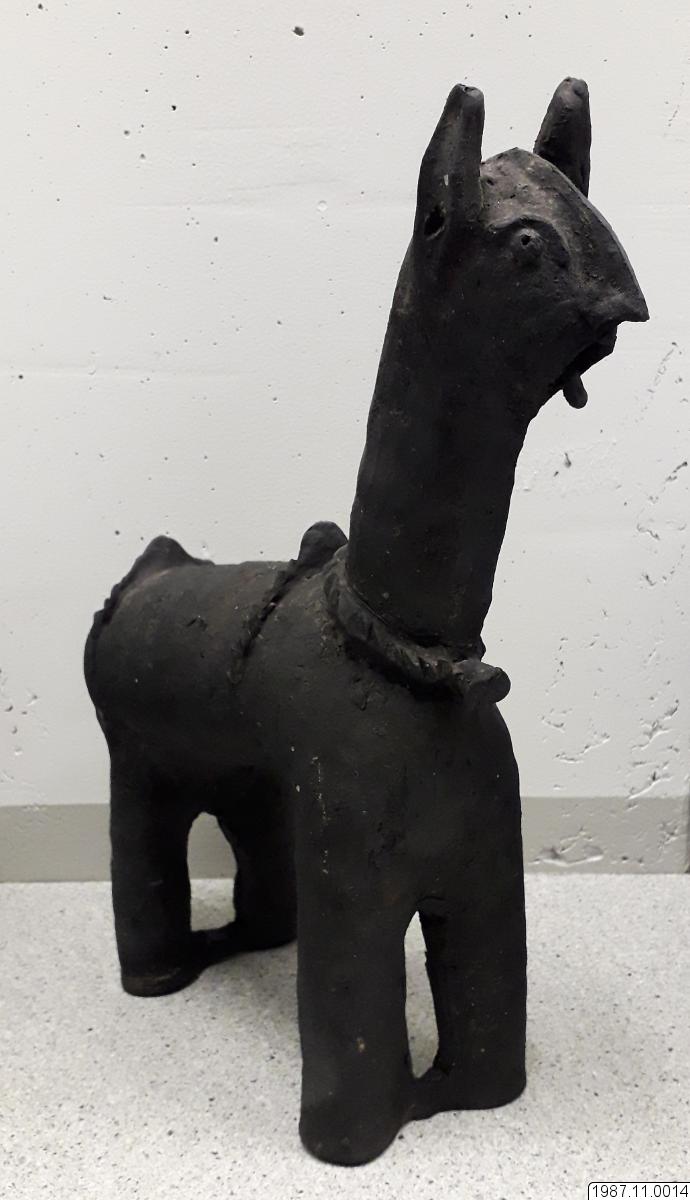 • Skulptur, möjligen ett kärl, i bränd lera.