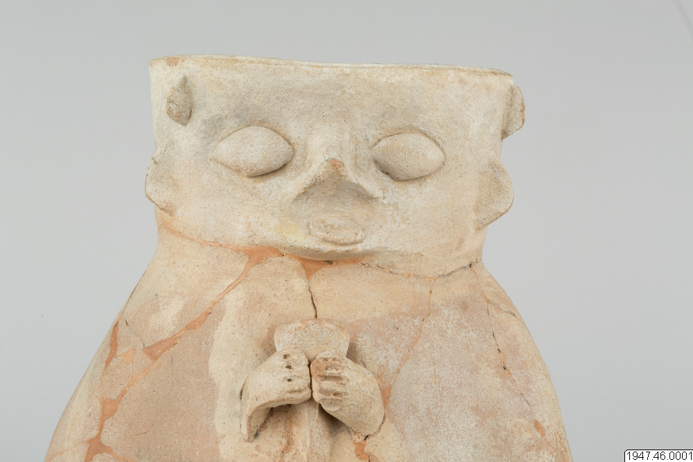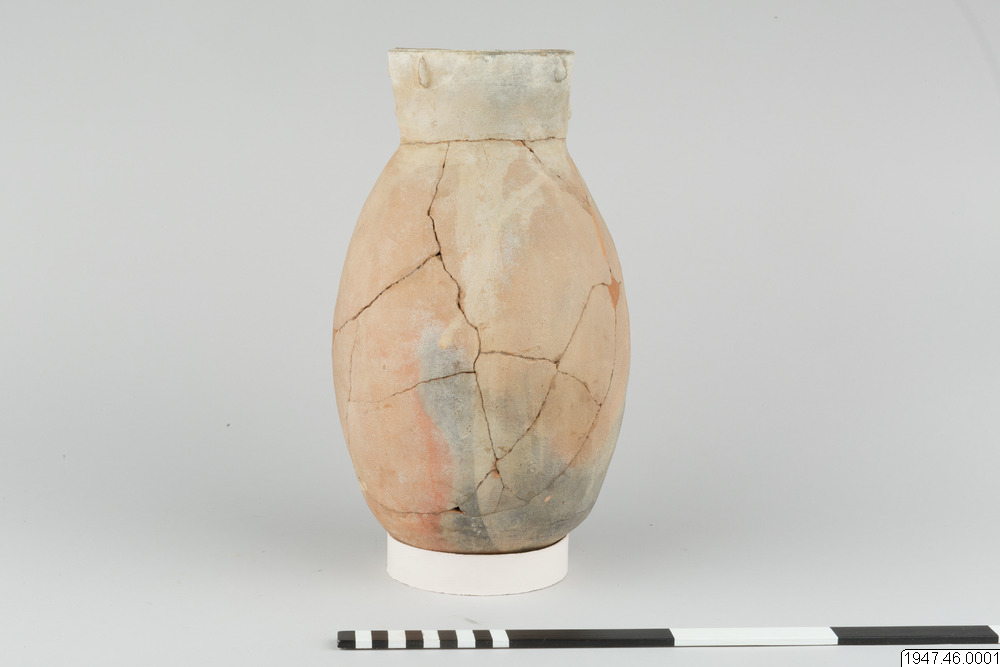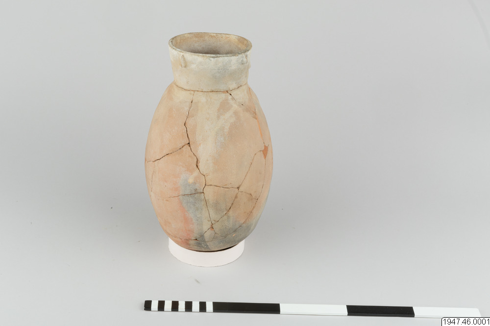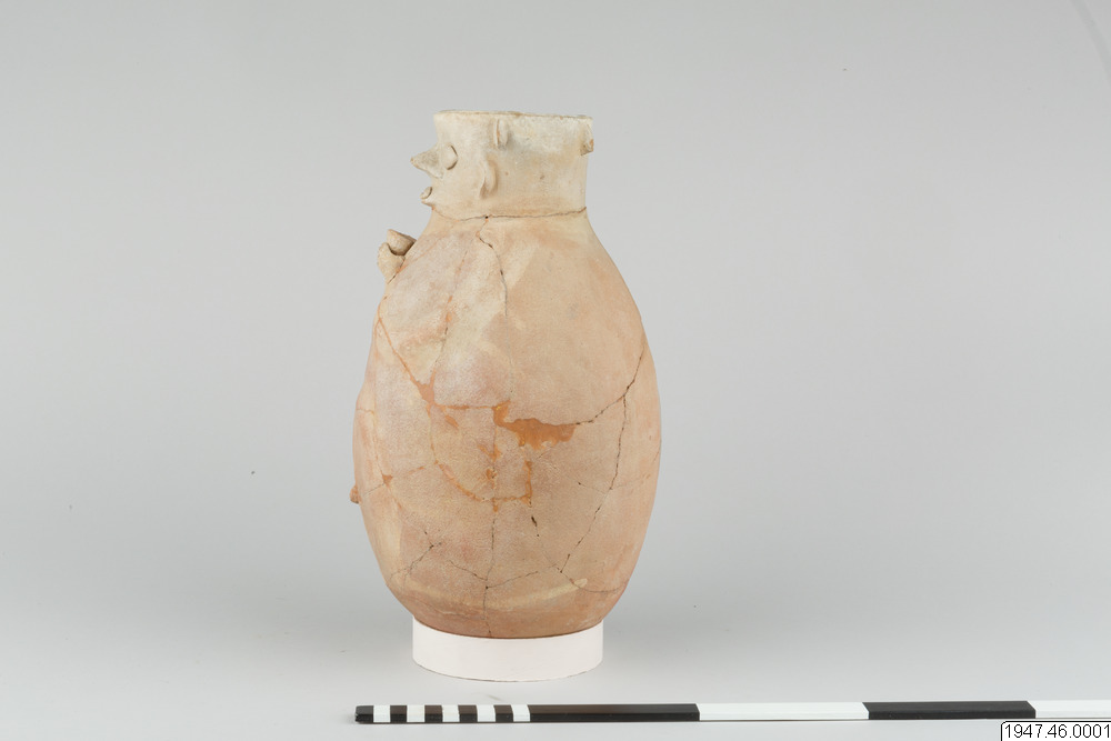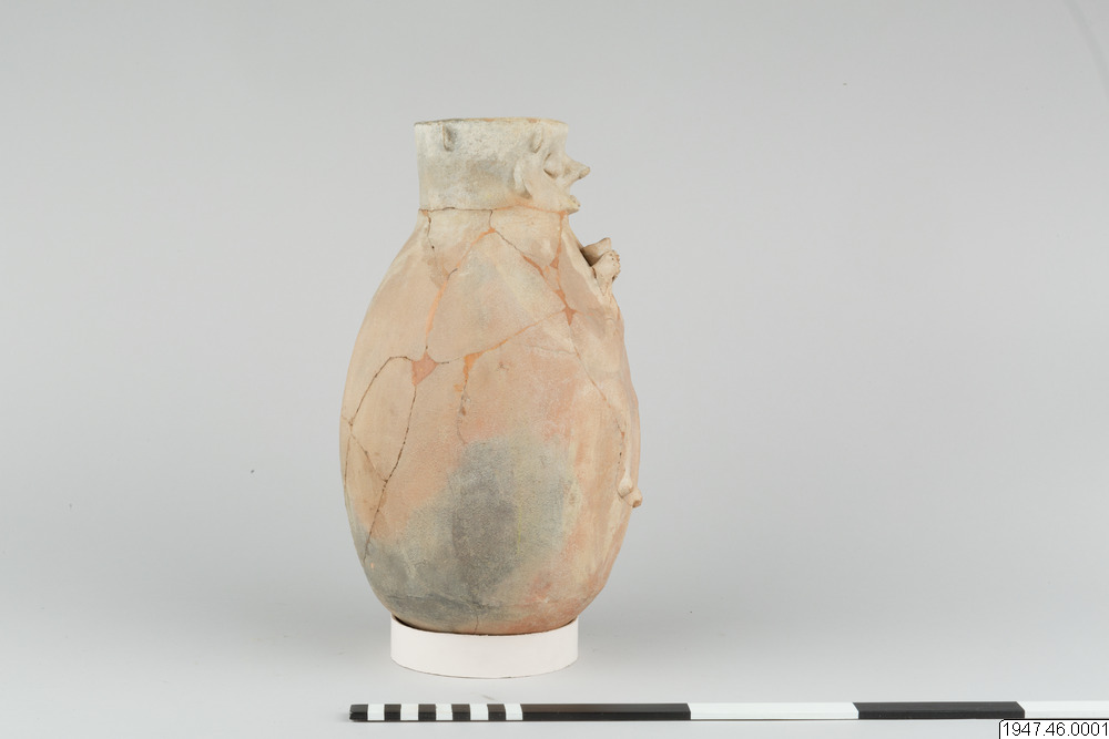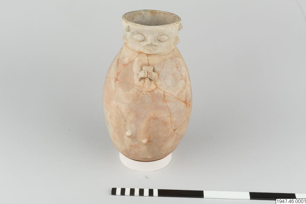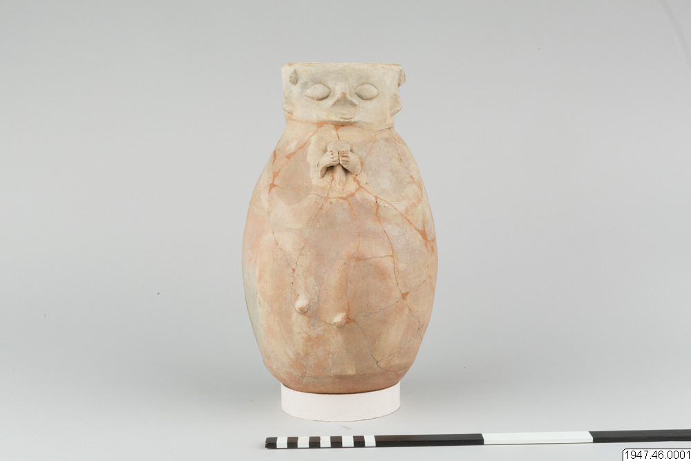 Lerkärl. Av brunaktigt gods, äggformigt och med ganska vid, svagt trattformig mynning. På ena sidan antropomorf dekor i relief. Ansiktet har sin plats på mynningskanten, händerna och benen på det bukiga partiet, båda svagt antydda med undantag av händerna, som håller ett dryckeskärl. Restaurerat.