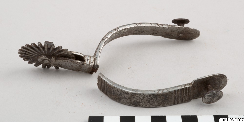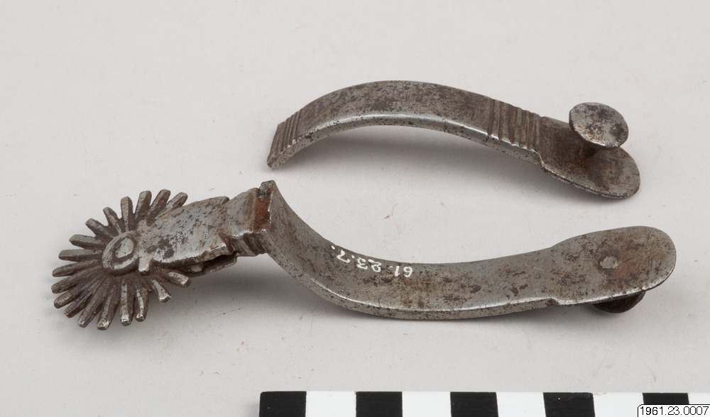 • Sporre av silverbeslaget järn och med reliefdekor. Klingan är nu fast. Föremålet är i två delar.