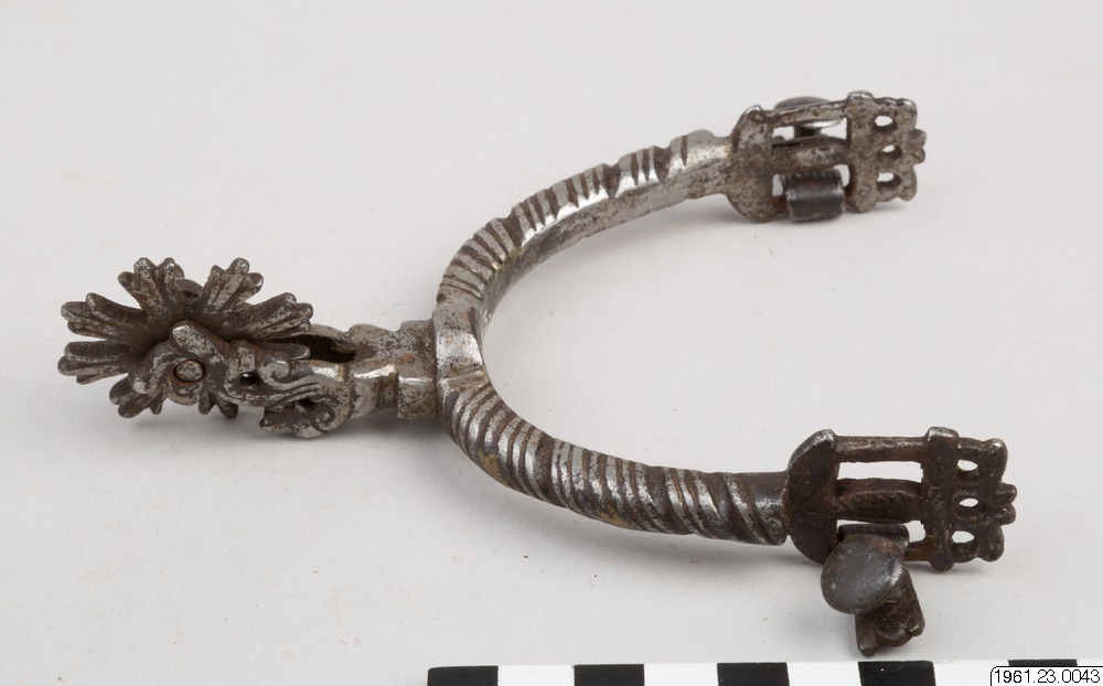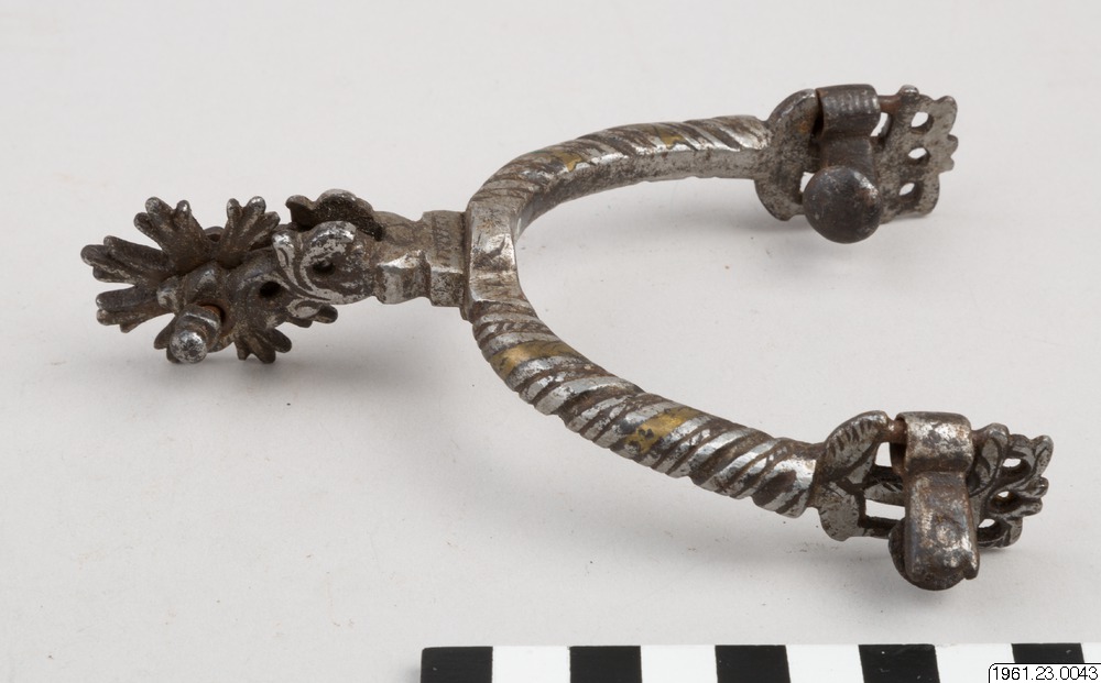 Sporre av järn, med klinga av 8 stycken radiala taggar, var och en smalast vid basen och bredast upptill, där den slutar med tre stycken spetsar. I övrigt genombruten dekor, reliefdekor och ingraverade linjer. Även spår av inlagd, gul metall (generalkatalogen).