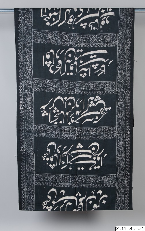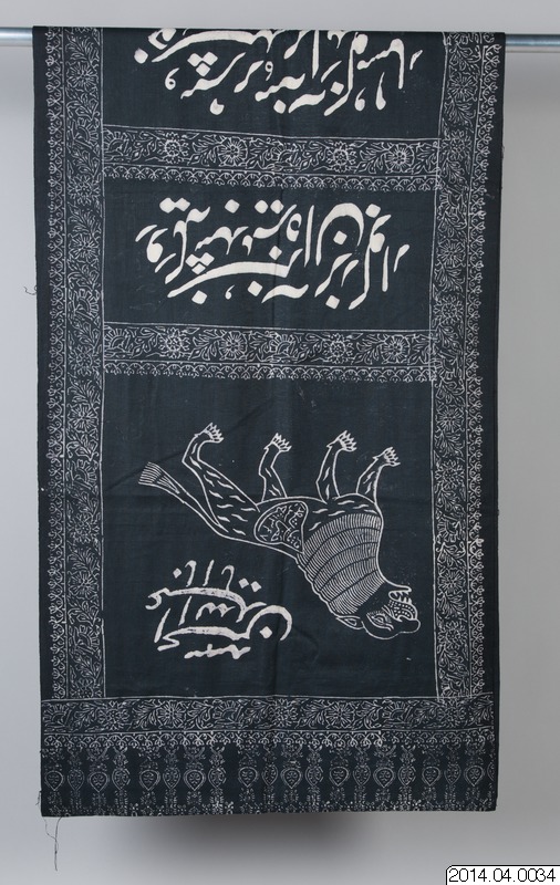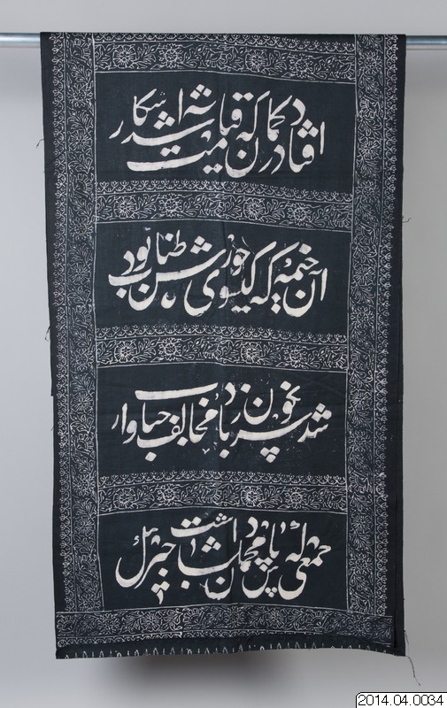 Tryckt svart bomullstyg med inskrift. Används vid firandet av Husseins död i månaden Muharram. Inköpt i basaren i Isfahan, Iran, sent 1970-tal. KGG/föremålsanteckningar.