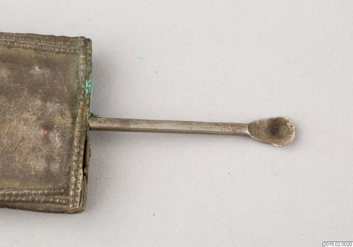 • Rektangulär kropp, ihålig, med dekorativ kant. Baksidan ej dekorerad. Tre ringar för hängning, samtliga saknar dekor. Smal slev med tydlig fördjupning.