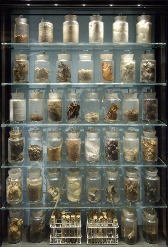 För inte så länge sedan reste folk inte så mycket och det fanns ingen tv eller internet. Tänk vad det måste varit spännande att komma till museet och se saker som man aldrig sett förut. Idag kanske det finns i en vanlig affär hemma eller så reser man själv och ser hur det ser ut. Här ser du en massa saker som samlades in från en plats i Kina för mer än 100 år sedan. Här finns burkar med olika innehåll. Känner du igen någonting som är i burkarna? Fortsätt till monter A med alla pilarna.