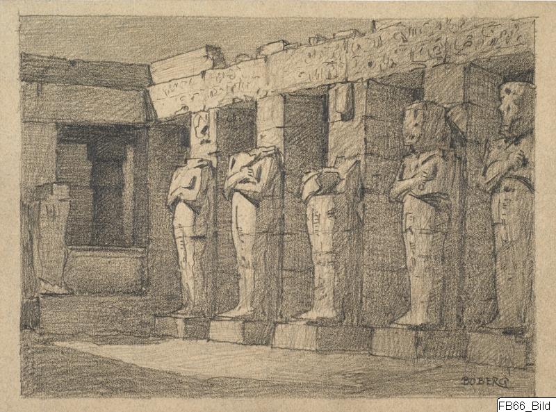 Karnak, Ramses III:s tempel. Teckning av Ferdinand Boberg 1921. Blyerts.Repro.