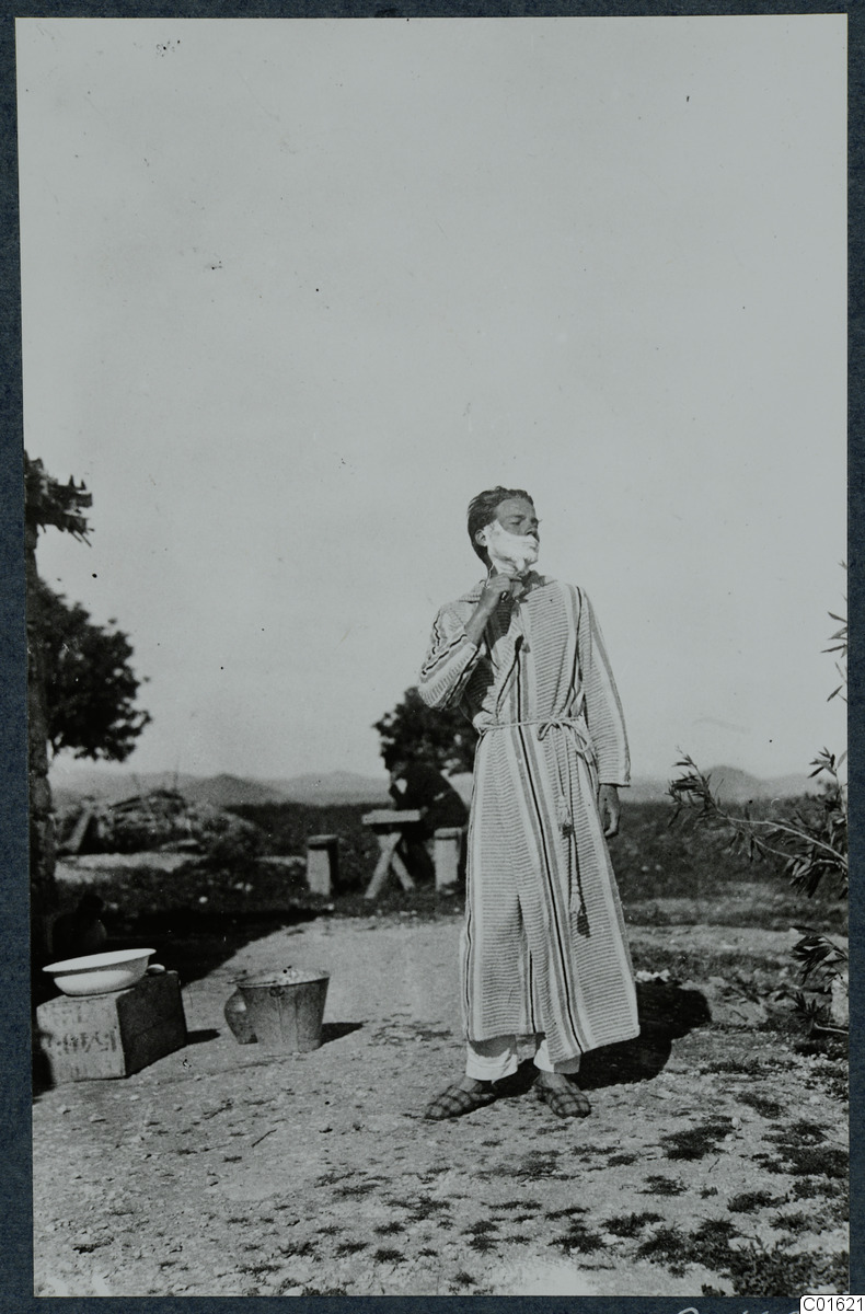 • Alfred Westholm shaving outside, wearing a housecoat.