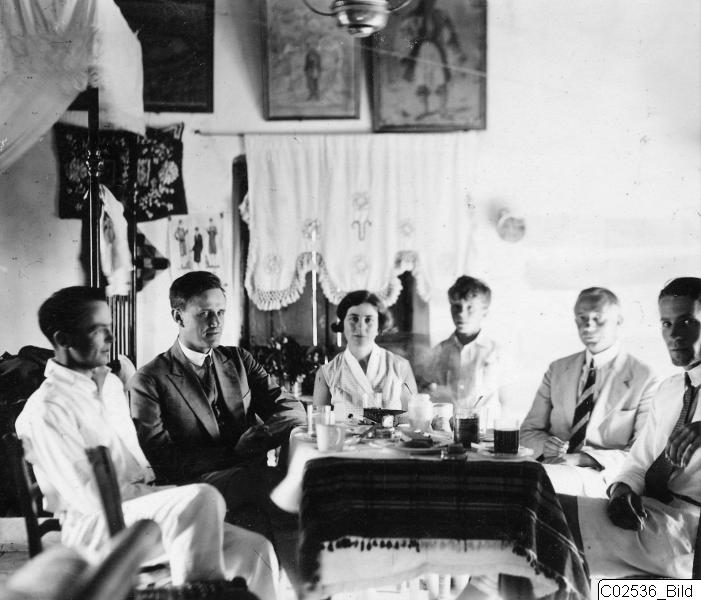 Fr.v. Erik Sjöqvist, Einar Gjerstad, Vivi Gjerstad, Stefan Gjerstad, John Lindros and Alfred Westholm sitting at a table together. Paintings, curtain.