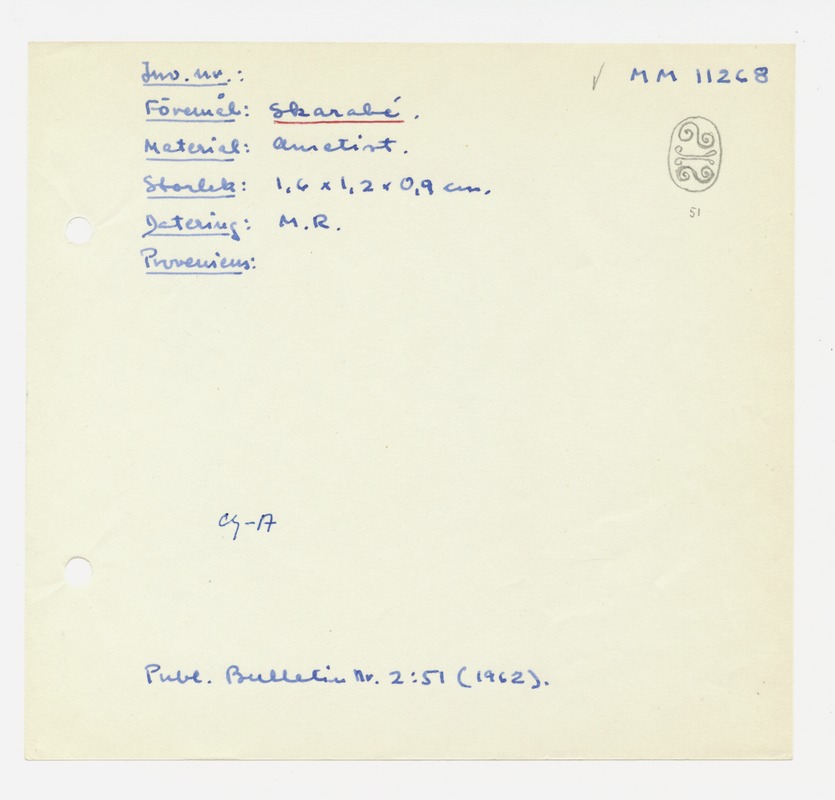 • Katalogkort ur Egyptiska avdelningens lappkatalog, D1B:3, Medelhavsmuseet. Riksantikvarieämbetet och Statens historiska museer, MM 11 000-11 499.