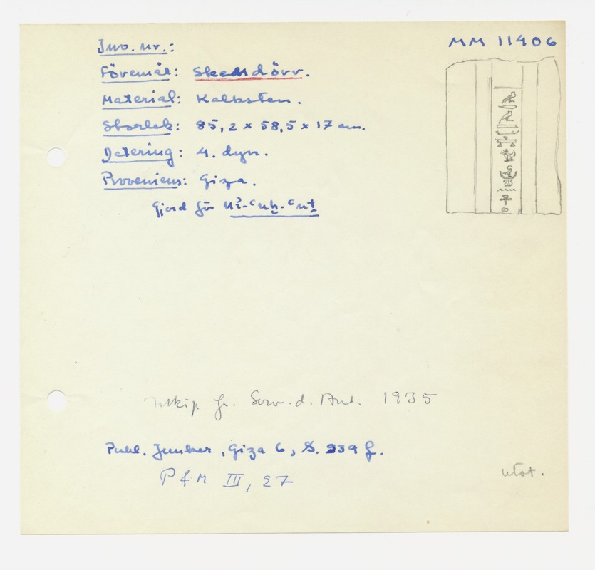 • Katalogkort ur Egyptiska avdelningens lappkatalog, D1B:3, Medelhavsmuseet. Riksantikvarieämbetet och Statens historiska museer, MM 11 000-11 499.