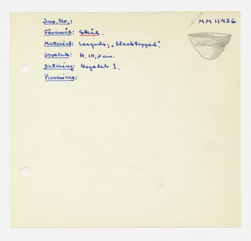 • Katalogkort ur Egyptiska avdelningens lappkatalog, D1B:3, Medelhavsmuseet. Riksantikvarieämbetet och Statens historiska museer, MM 11 000-11 499.