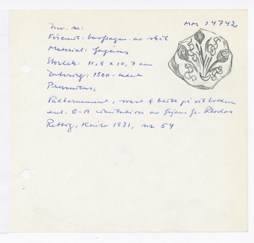 • Katalogkort ur Egyptiska avdelningens lappkatalog, D1B:6, Medelhavsmuseet. Riksantikvarieämbetet och Statens historiska museer, MM 14 500-14 999.