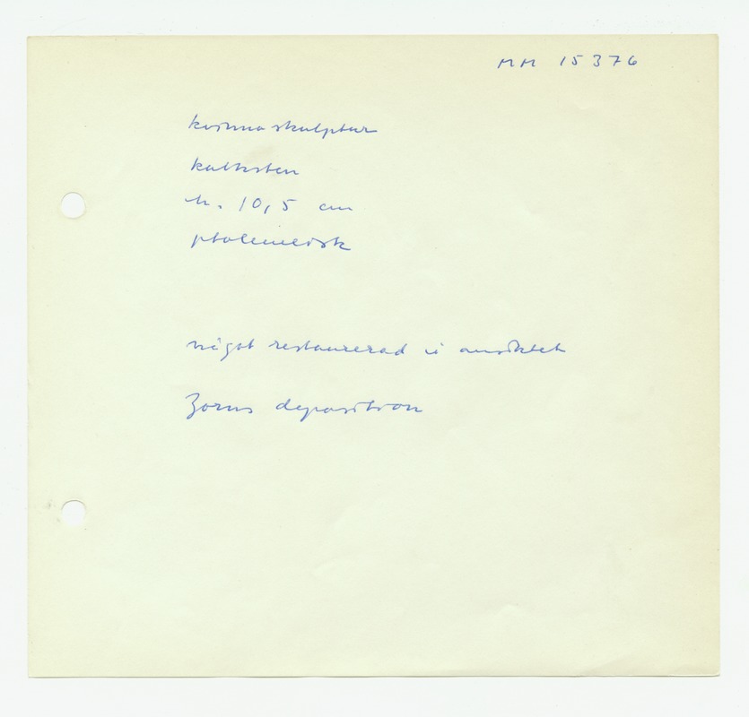 • Katalogkort ur Egyptiska avdelningens lappkatalog, D1B:7, Medelhavsmuseet. Riksantikvarieämbetet och Statens historiska museer, MM 15 000-15 499.