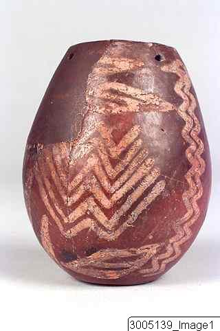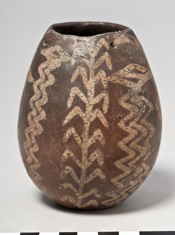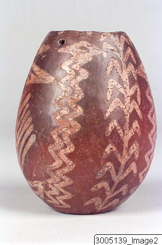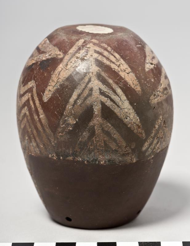 A vessel with an ovoid body, restricted mouth and a flat base. Red-polished exterior with white cross-lined decoration. It features plant motifs, multi linear zig-zag patterns, vertical parallel rippled lines and lozenges. Adjacent to the rim are four perforations (suspension holes), situated opposite one another, of which two belongs to the restored part of the vessel.